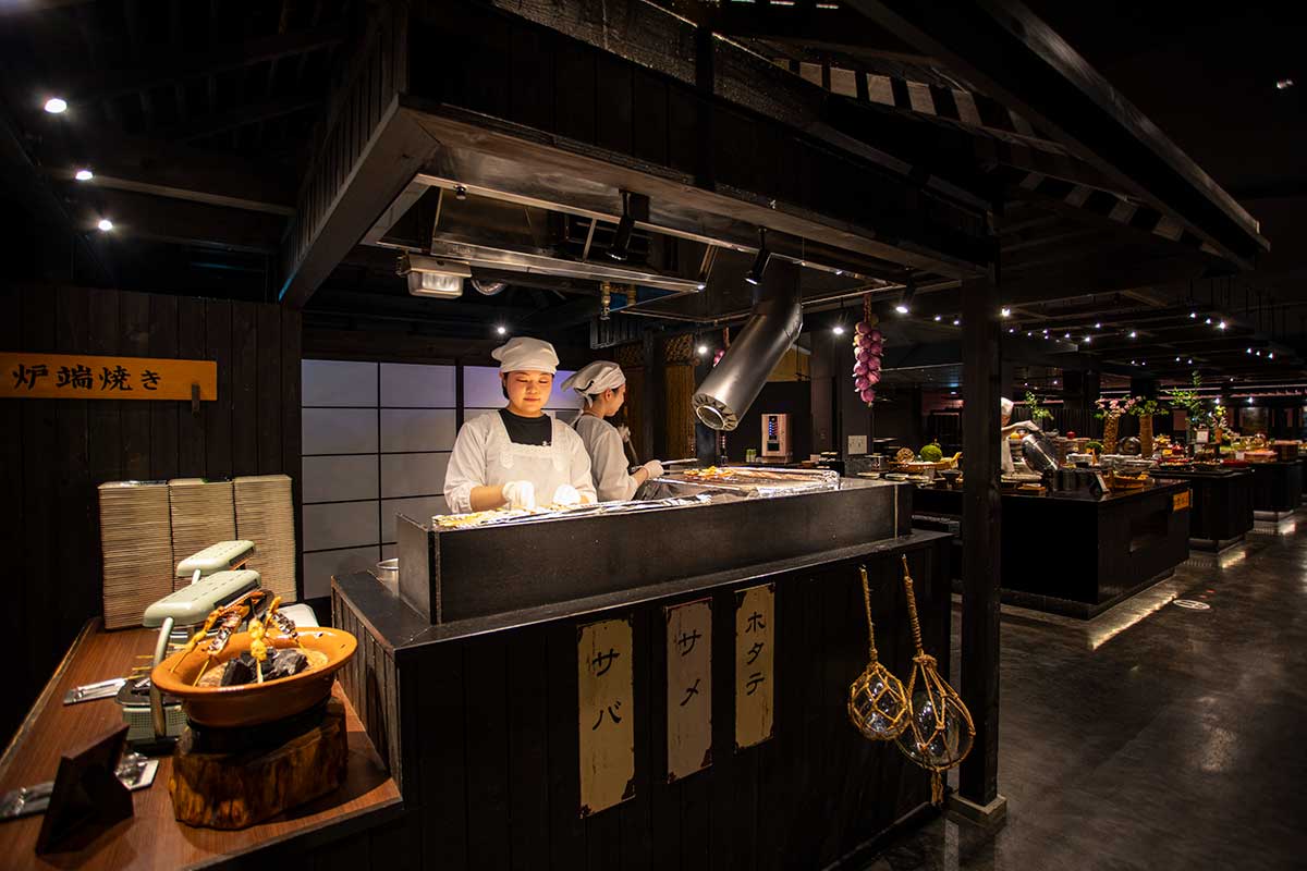 ふるさとの民家をイメージした店内では、割烹着姿のスタッフが炉端でサバやホタテを焼いている。