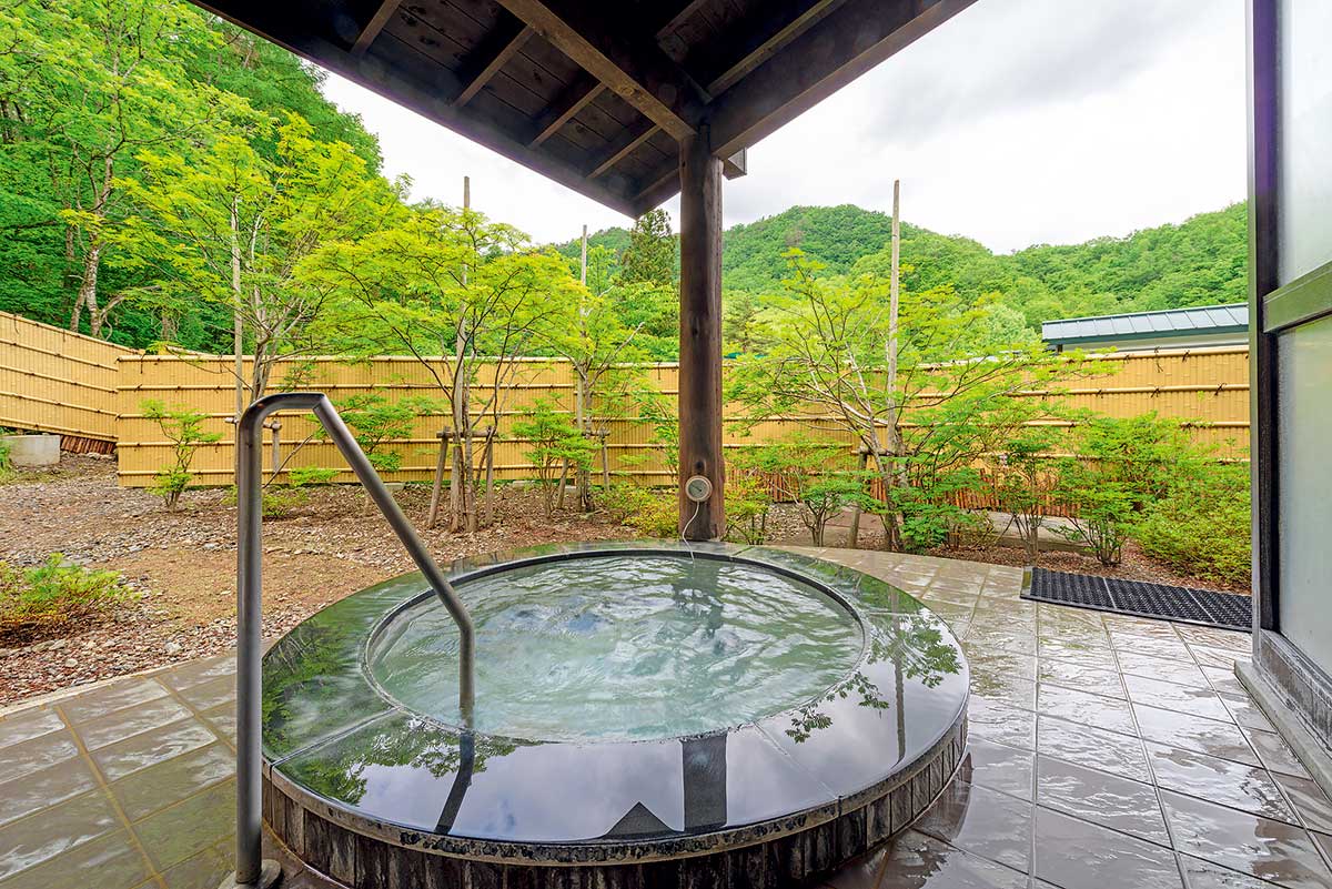 2023年にリニューアルした「ユニバーサルツインルーム」には檜風呂も備わり、山里の中で贅沢なひとときを過ごせる。