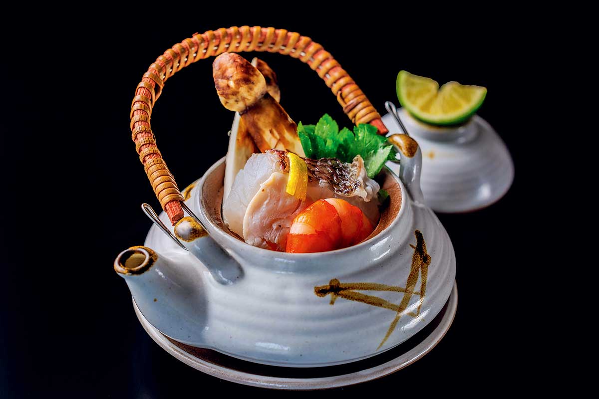 松茸ならではの芳醇な香りを楽しむ土瓶蒸しは、紅葉鯛や海老などの旨みが溶け出した出汁とともに。