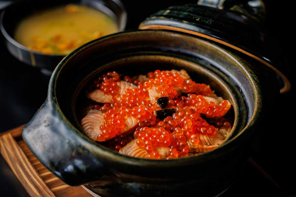 土鍋で炊くはらこ飯はふっくらつやつや。頬張るたびに鮭の旨みが広がり、コース終盤でもぺろり。※写真は2人前