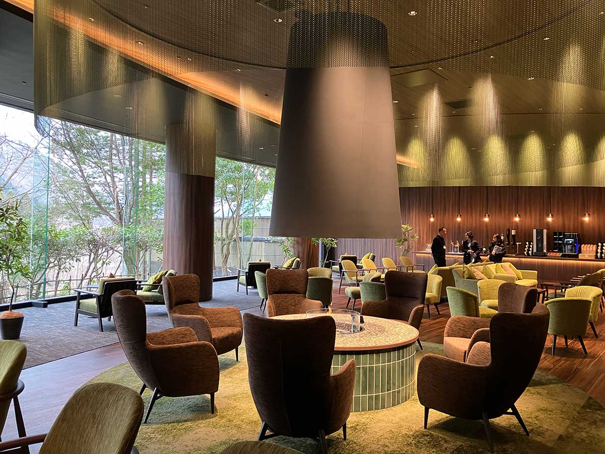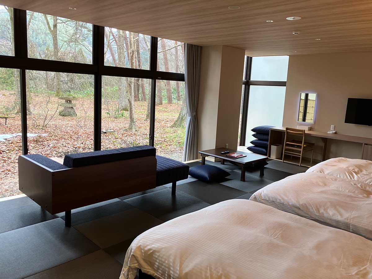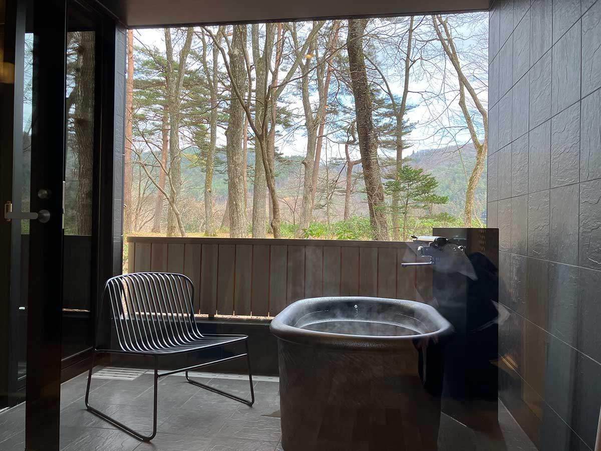 大きな窓の先には「インフィニティ温泉」にリノベーションした露天風呂が配され、湯に浸かりながら四季の移ろいを感じられるつくりになっている。