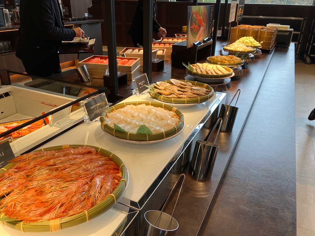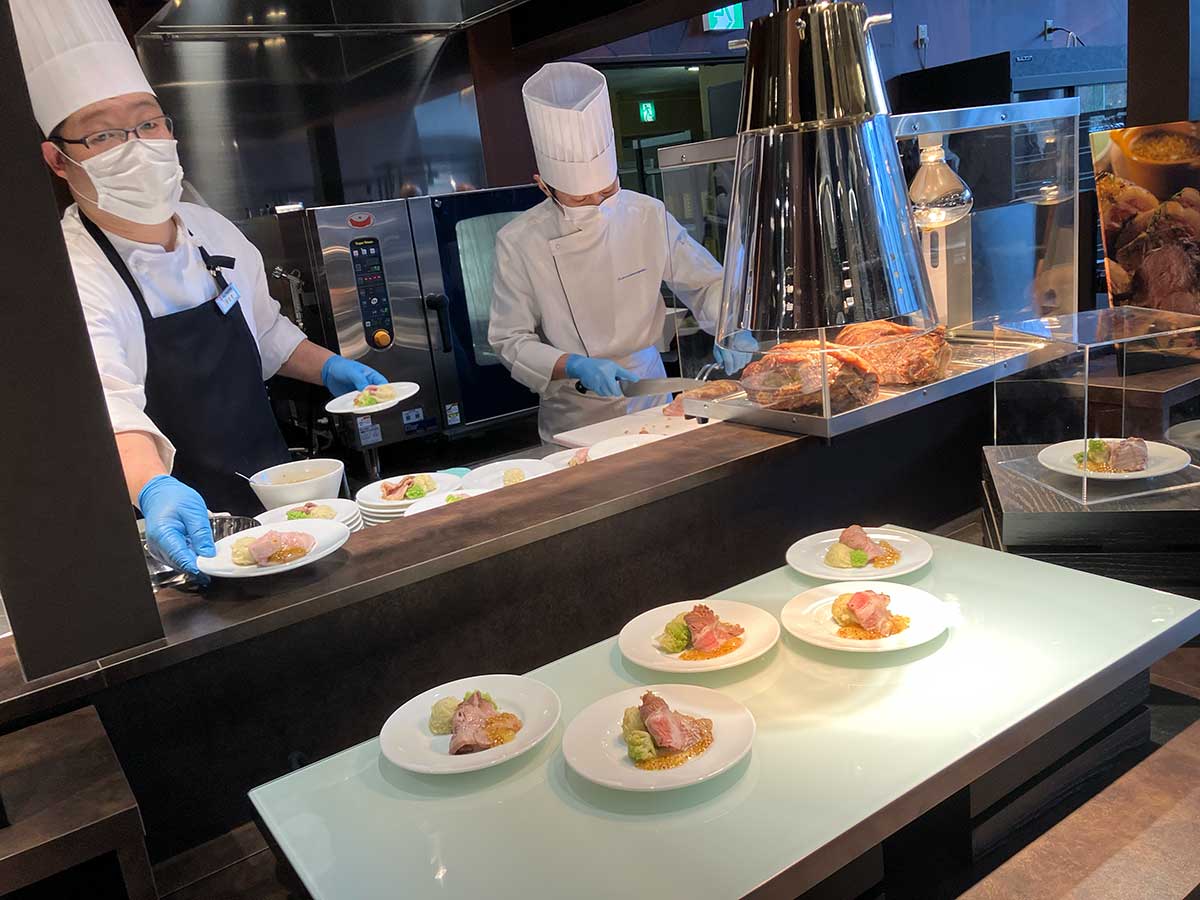 ライブキッチンでは、花巻の特産「白金豚」のローストや、牛ステーキ、天ぷらなどをできたてで提供。