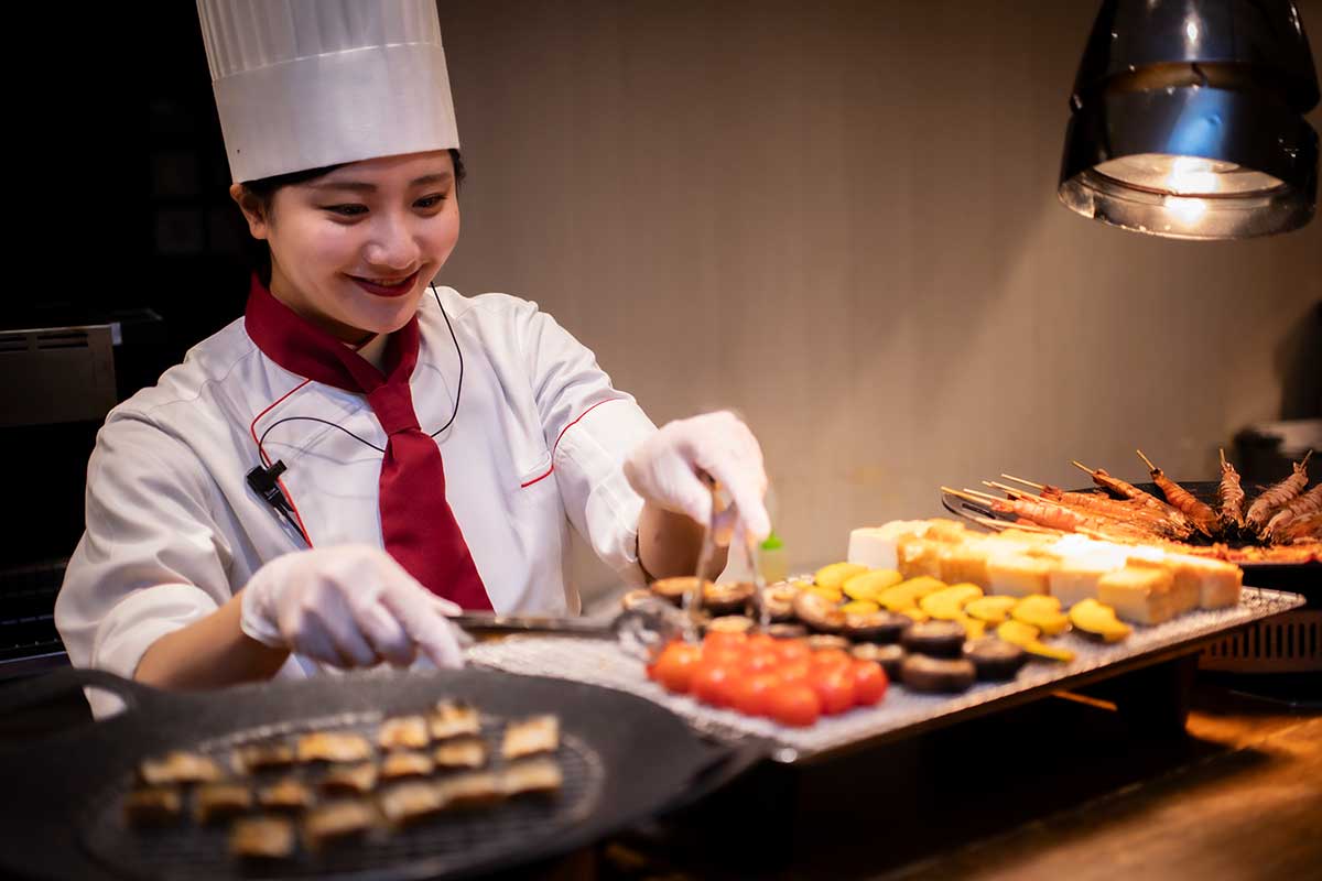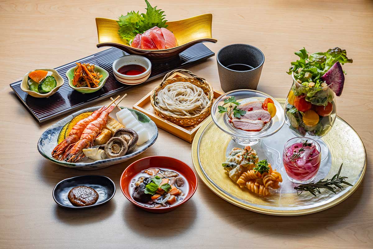 会津の郷土料理「こづゆ」や発酵文化を取り入れた料理のほか、ライブキッチンの手打ちそばや炉端焼きを楽しもう。