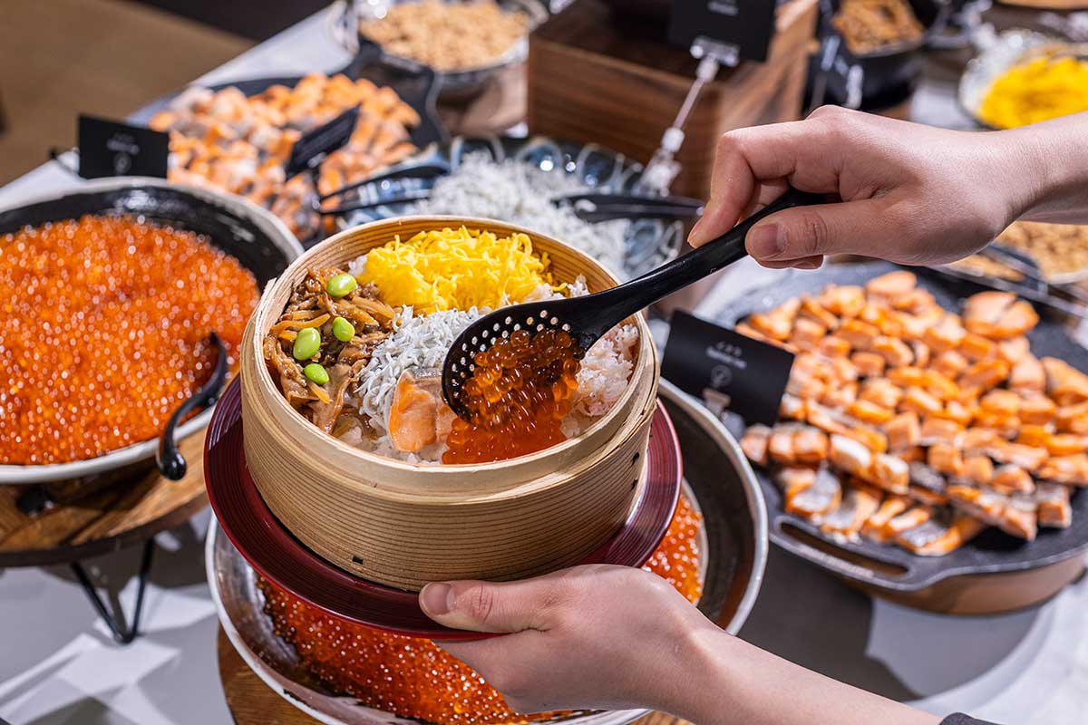 「わっぱ飯」は、せいろ蒸しの白米にカニのほぐし身や塩鮭、イクラ、錦糸卵などを自分好みに盛り付けできる。