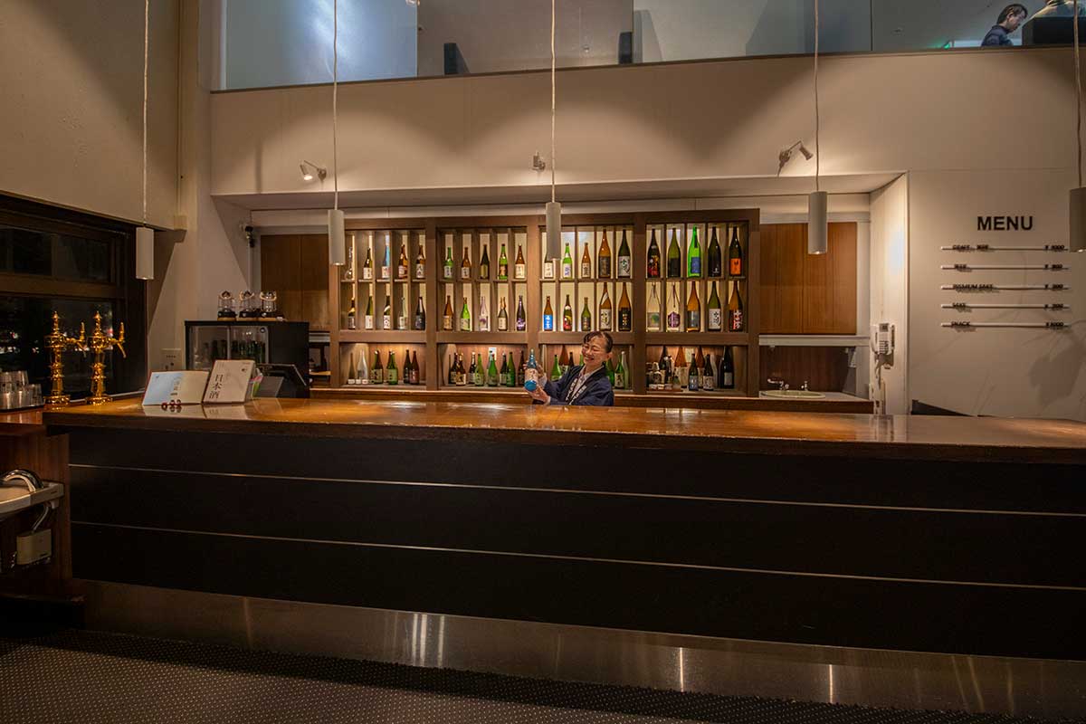 館内の日本酒を選んでいる利き酒師・小野ひろ子さん。「会話しながら、好みの味を見つけるお手伝いをいたします」