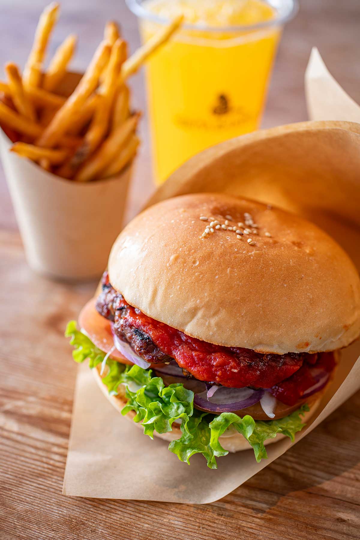 パティは赤身を中心に粗挽きと中挽きをブレンドし、薫香をまとうように焼き上げるため、ソースに負けない主張がある。