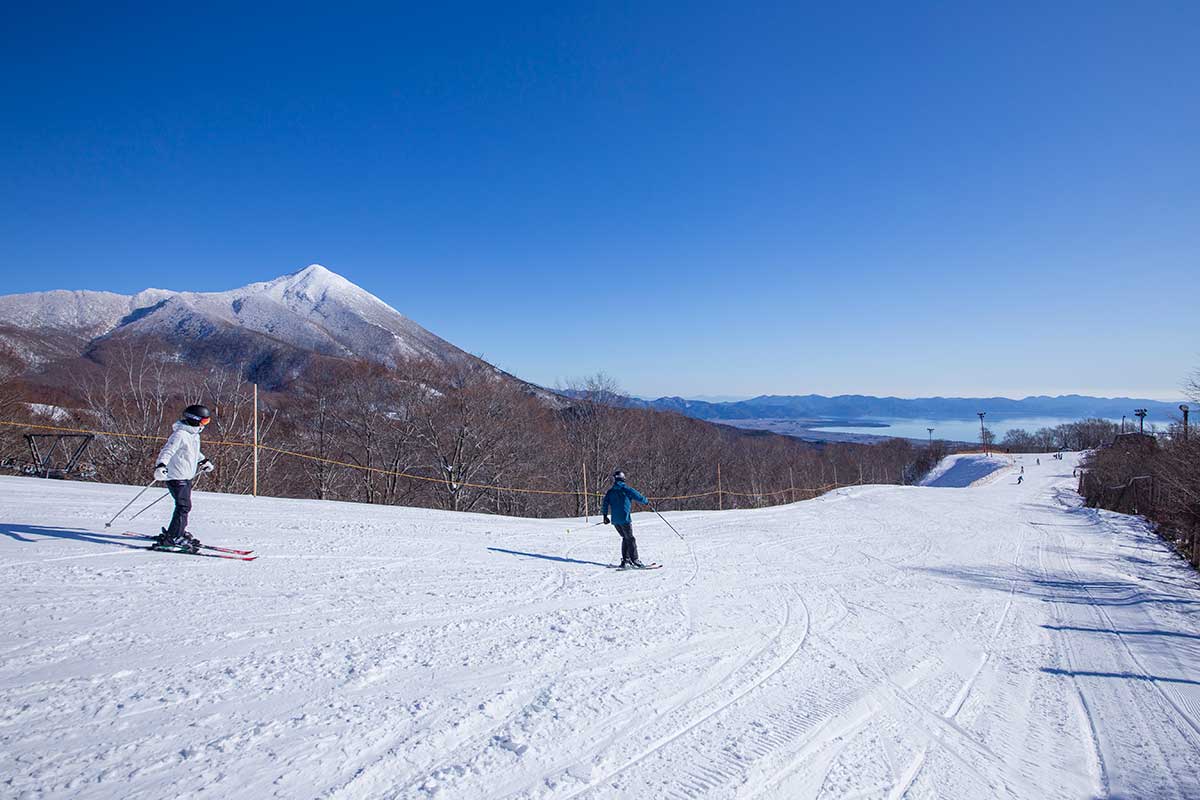 磐梯山と猪苗代湖を一望できる「星野リゾート ネコマ マウンテン」の南エリア。良質なミクロファインスノーを湛える北エリアは、雪量が豊富なためゴールデンウイークまで滑れる。