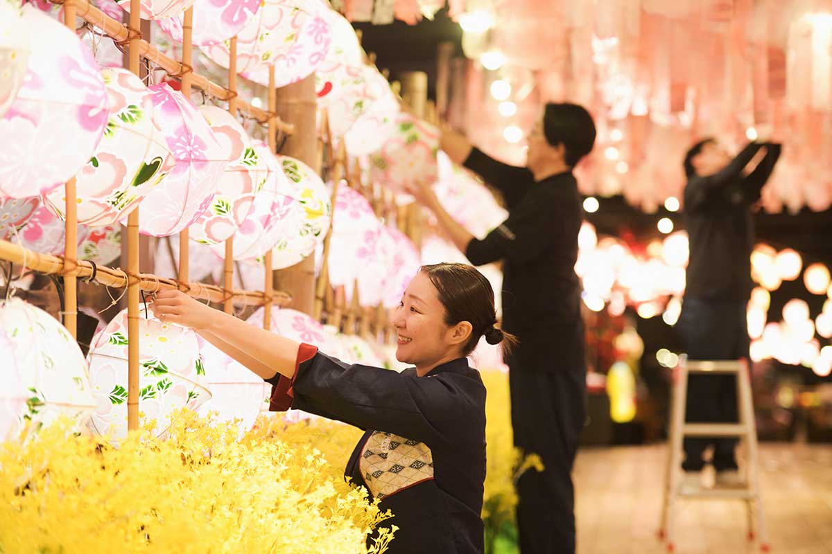 季節で変わる「じゃわめぐ広場」の装飾はスタッフが行う。客の笑顔を想像しながら、「春告げ小径」を準備中。