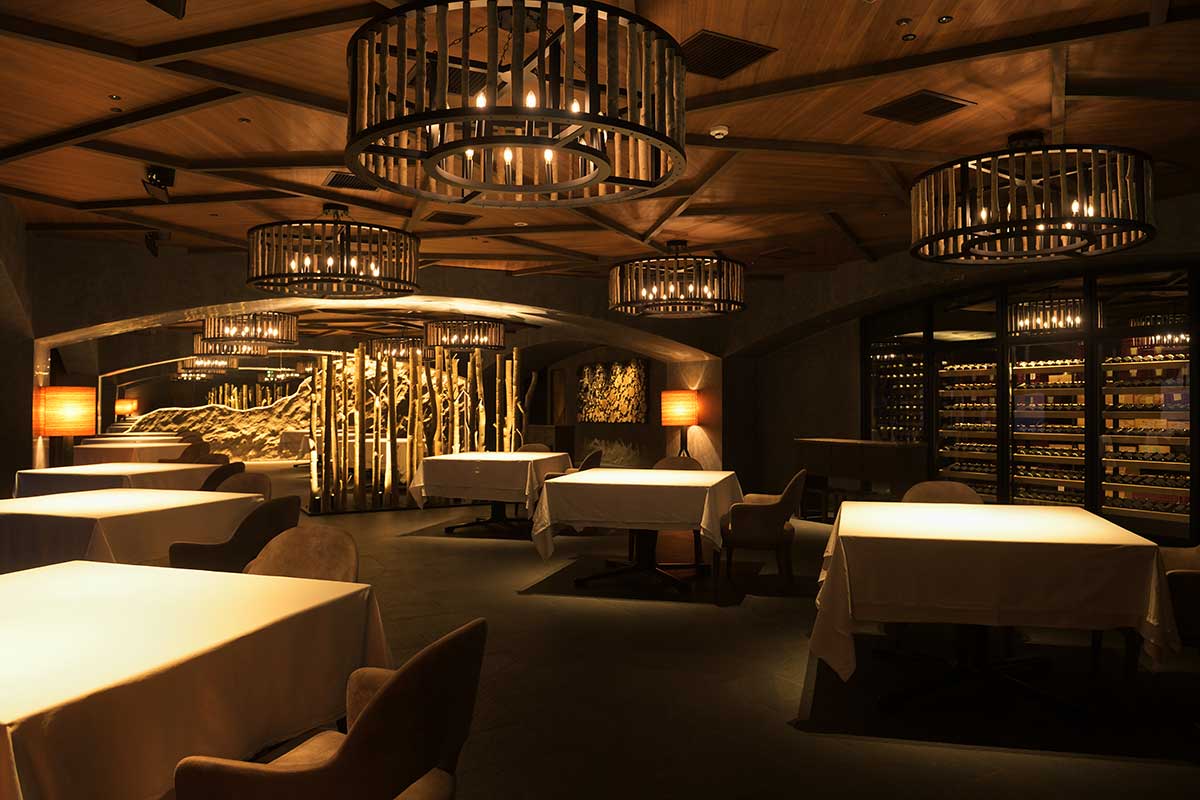 奥入瀬渓流の神秘的な雰囲気と重なるシックな店内。『Sonore』のディナーは渓流テラスでのアペリティフから始まる。