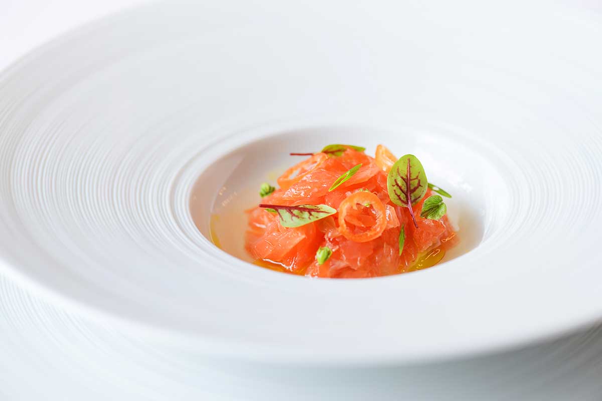 主役は青森の清流で養殖された「青い森紅サーモン」。総料理長の簔原諒さんが、『沼袋養魚場』の松本竹夫さんを訪ねて惚れた食材だ。
