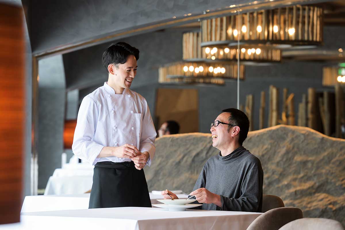 松本さんが簔原さんの料理を食べるのは初めて。「繊細な中にサーモンの香りも旨みもしっかり感じられて、生産者としてうれしいです」