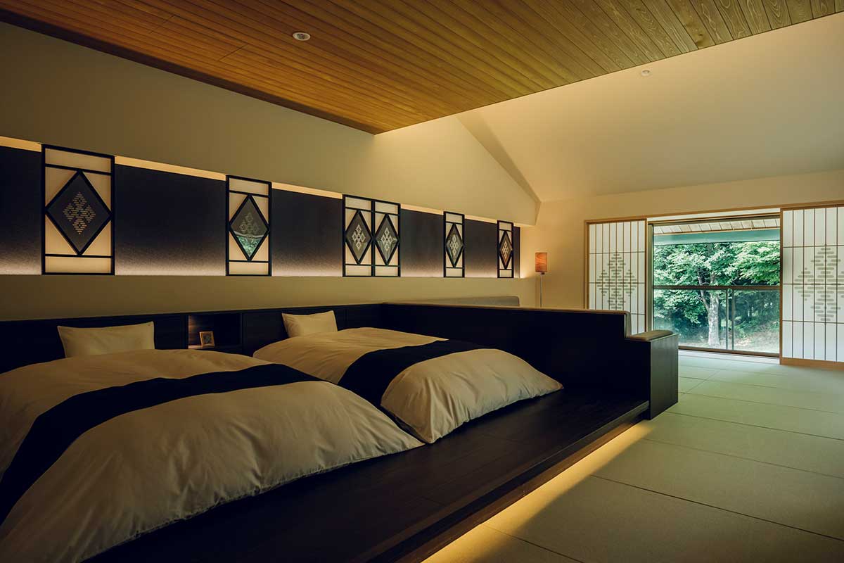 客室は、伝統工芸である津軽こぎん刺しのモチーフに包まれた「津軽こぎんの間」。モダンな空間で寛ぎの時間を。