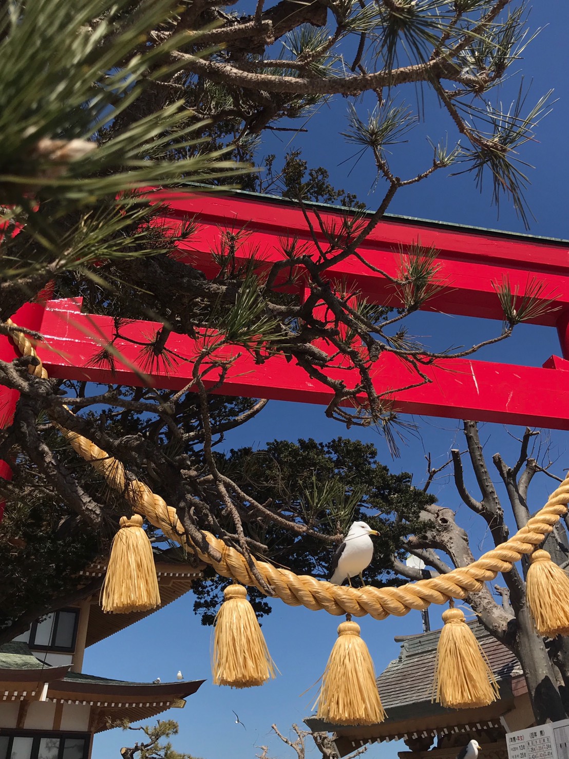 毎年3月から8月頃まで子育てのために約4万羽のウミネコが飛来。社殿の裏手から眺める、荒々しい岩肌と、青い海を悠々と飛び交うウミネコの姿は壮観です。