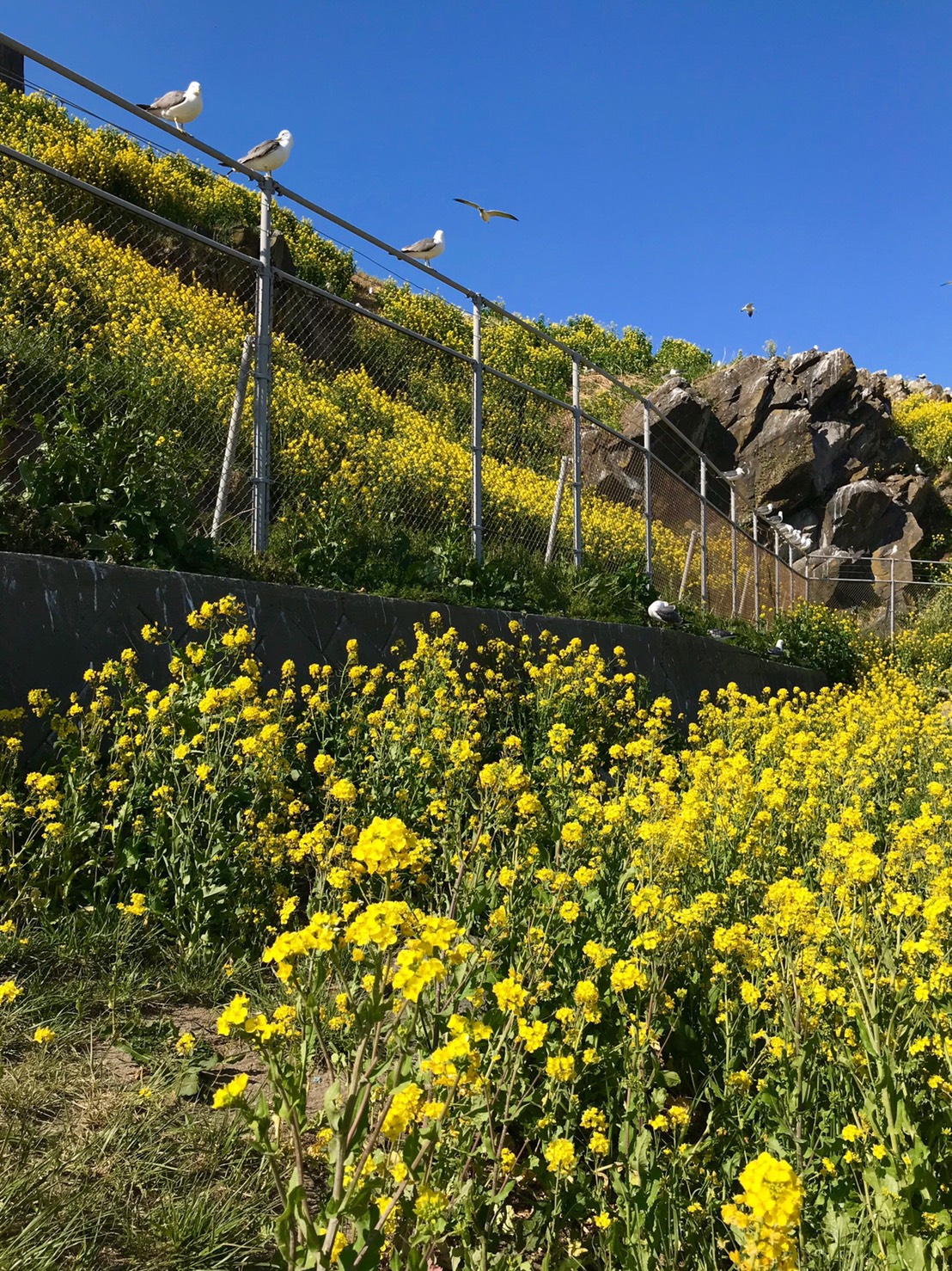 蕪島のベストシーズンは、まさにこれから。5月中旬には島全体に菜の花が咲き乱れ、菜の花の黄色、空の青、ウミネコの白、大鳥居の赤という美しい彩のコントラストがお楽しみいただけます。