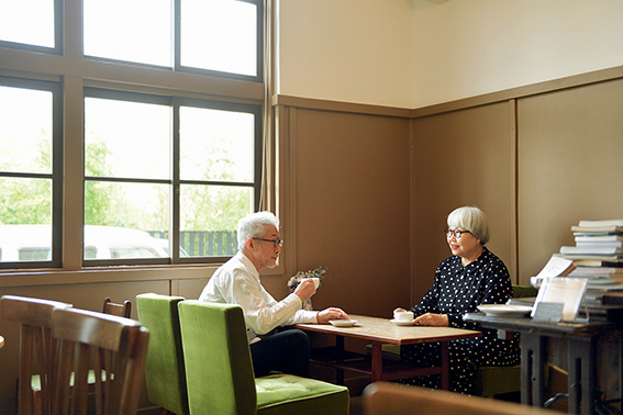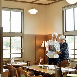 再び1階に下りたふたりは、渡り廊下の先にある大講堂へ。高さ9.7m、ゆるやかなアーチで構成された大空間は、建築としての美しさはさることながら残響も美しく、コンサートなども開催されている。市民にも貸し出しているため、ここで地域の方が健康体操やダンスの練習をすることもあると聞いたbonさんは「贅沢な使い方ですね、羨ましい」と笑う。最後は玄関ホール横にある『塩竈本町談話室』でコーヒー片手に語らうふたり。窓の外に見えるのはエドヒガンザクラ。この日は寒の戻りで肌寒く、花開く気配もなかった蕾だが、そろそろ桜の便りが届きはじめる頃。「暖かくなったらまた来たいね。今度は駅から散歩しながら」とbonさん。ふたりが待ちわびる春はもうそこまでやって来ている。