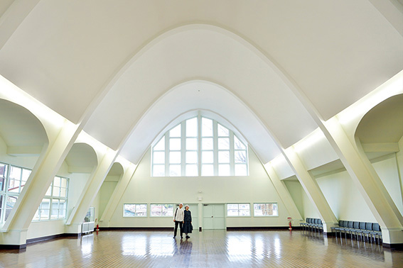 驚くことに、大講堂のアーチは木造。集成材が描く曲線によって、柱のない大空間が見事に構成されている。