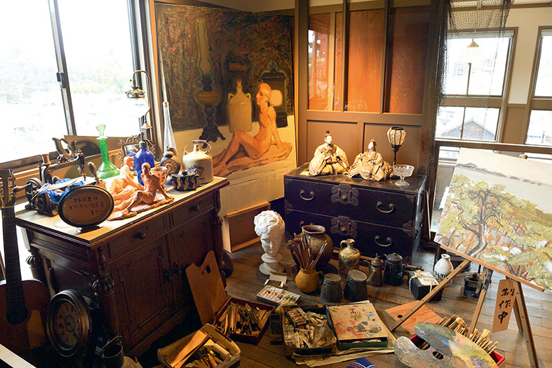 館内には絵のモチーフとなったアイテムが点在。アトリエを再現したコーナーのほか、かつて映写室だった部屋にもコレクションが並ぶ。