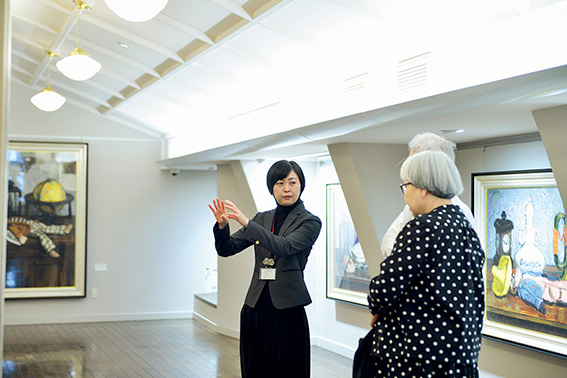 学芸員の阿部沙斗加さんに案内されるふたり。専門学校でデザインや絵を学んだふたりは、阿部さんの話に熱心に耳を傾ける。