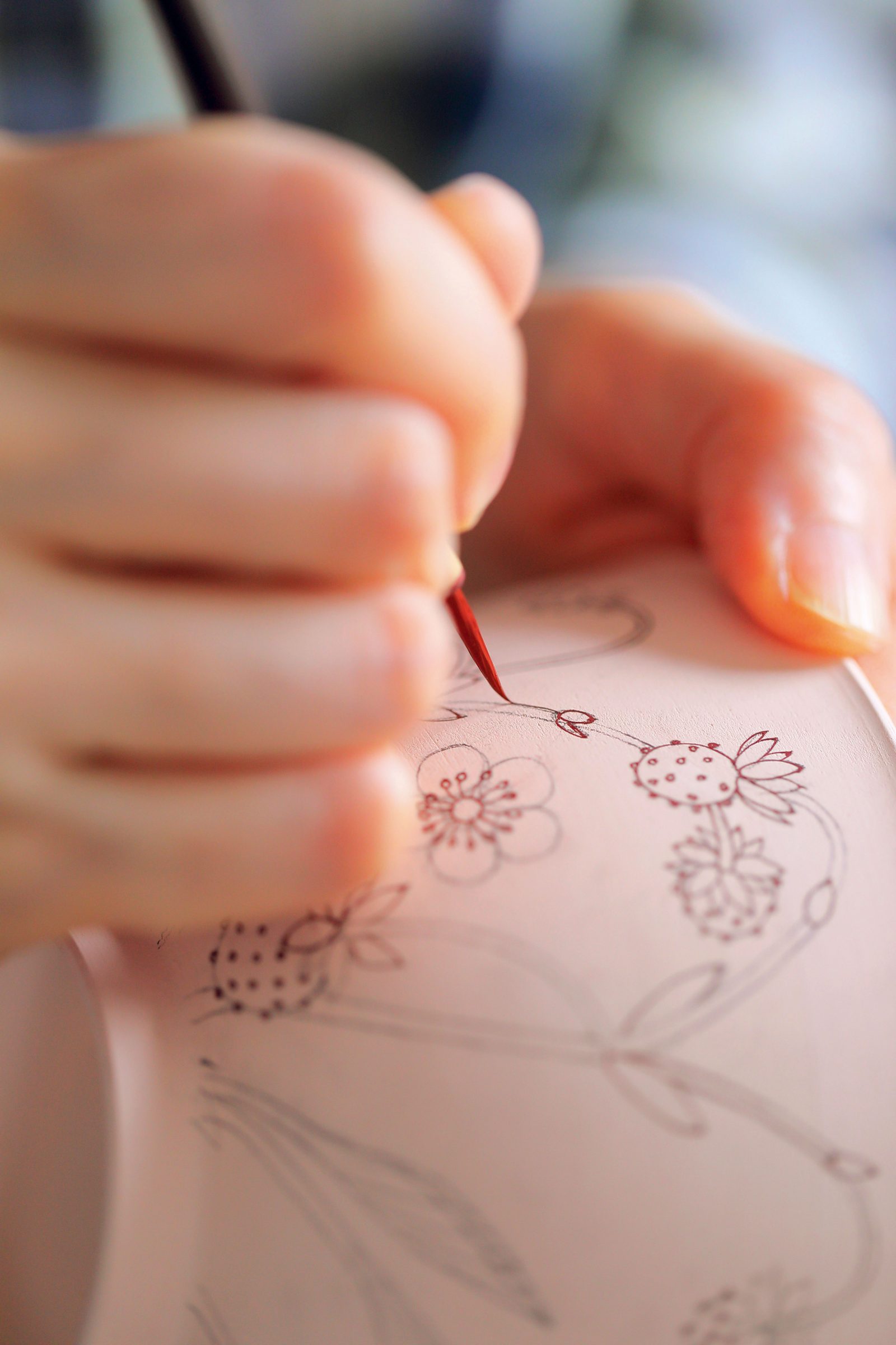 磁器土を練り、薄造りの形を作るのに早くて1カ月、時には2~3カ月を要する。乾いた後も削って調整し、素焼きしてから絵付け。ここが最も神経を使う作業だ。日本画用の筆と紅柄で線を引くときは、思わず息を止めてしまうという。
