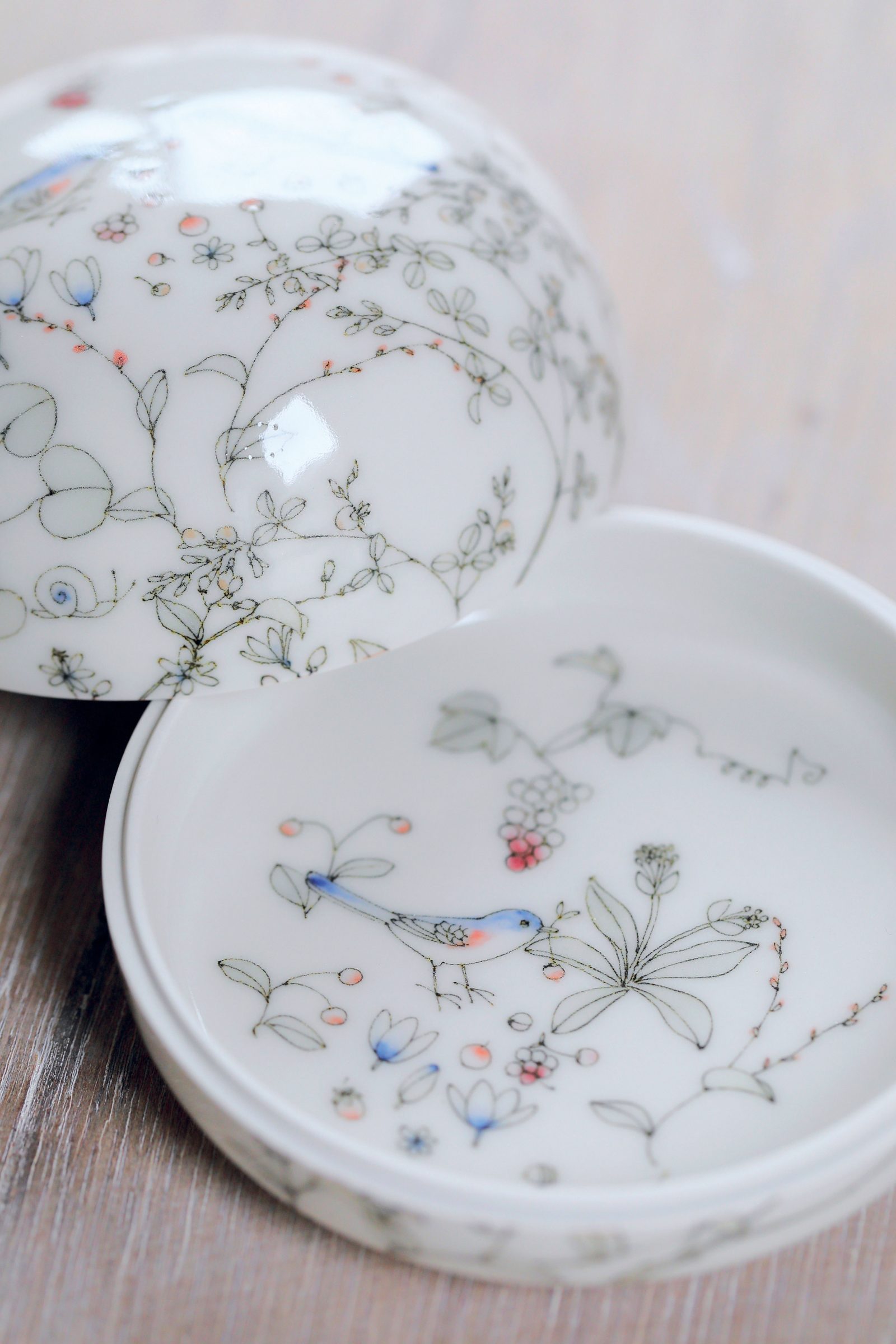 細かなラインで描かれた植物や小鳥たち。童話のように愛らしい世界が、岸上まみ子さんの筆先から生まれる。「大学で陶芸部に入ったことがきっかけでした。土もので紐作りやろくろ、大学院の頃には色鮮やかな色絵磁気をやっていました」。