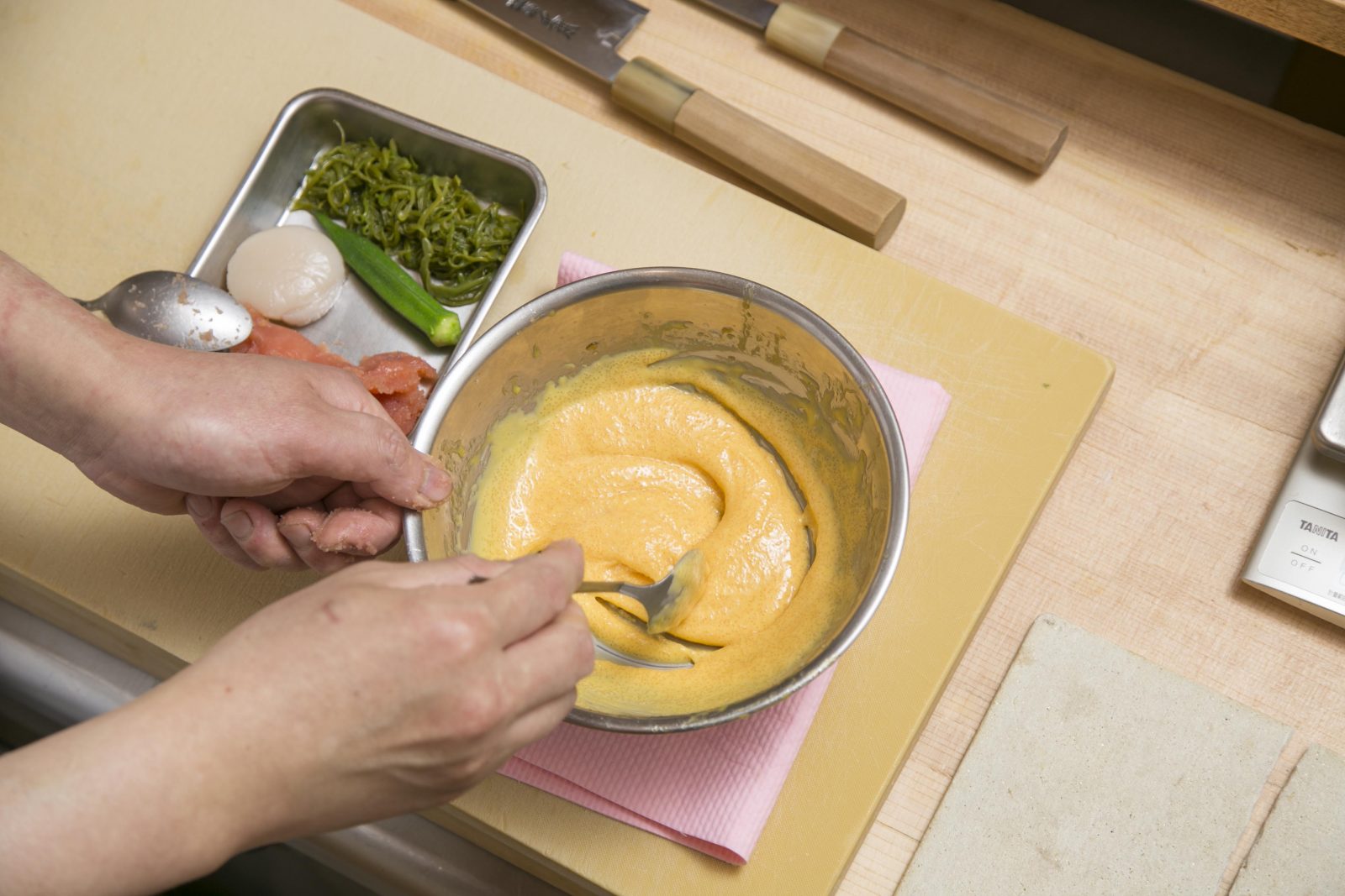 羅列する食材の名前を聞いただけでは「本当に合うの?」と疑ってしまいそうになりますが、この料理には食材同士を好相性へと引き上げる重要な役割があります。それは「玉素(たます)」と呼ばれる卵黄と油を合わせたもの。