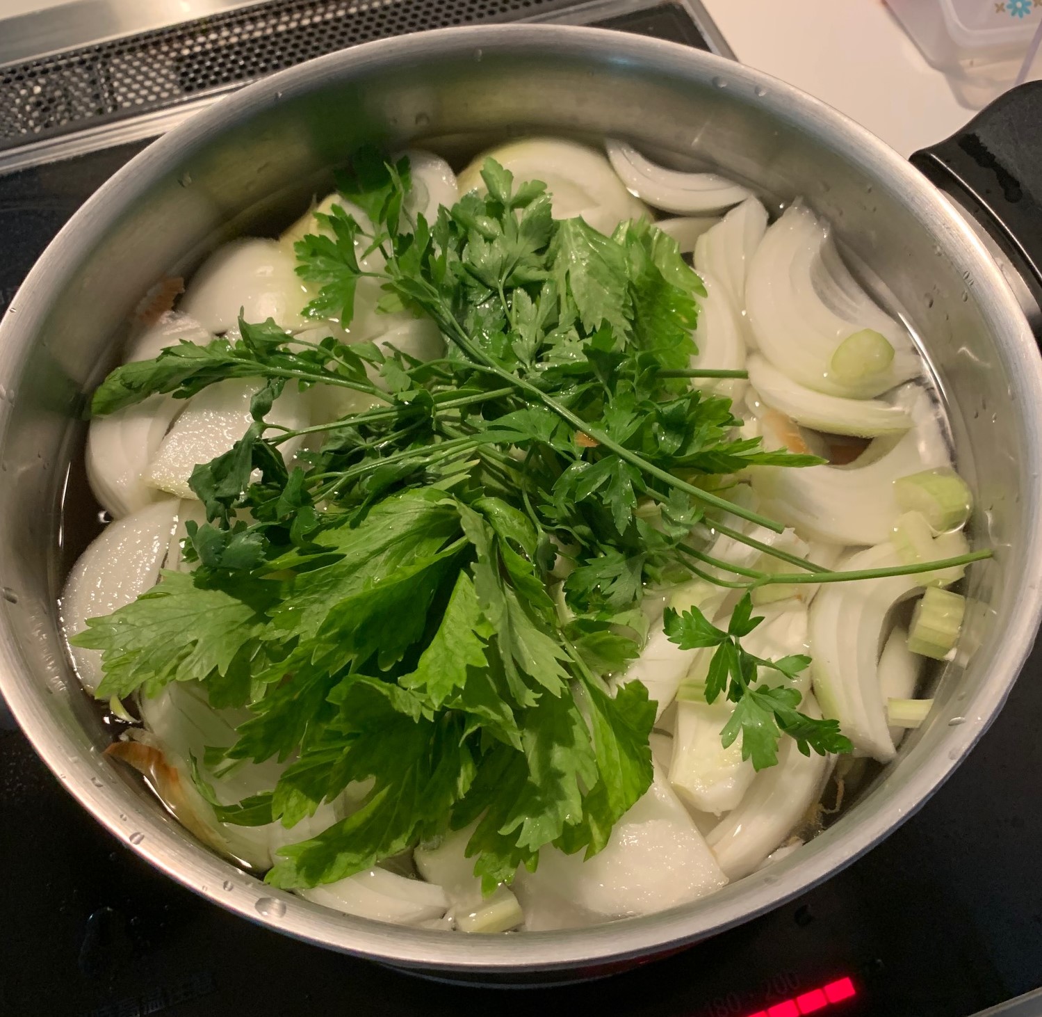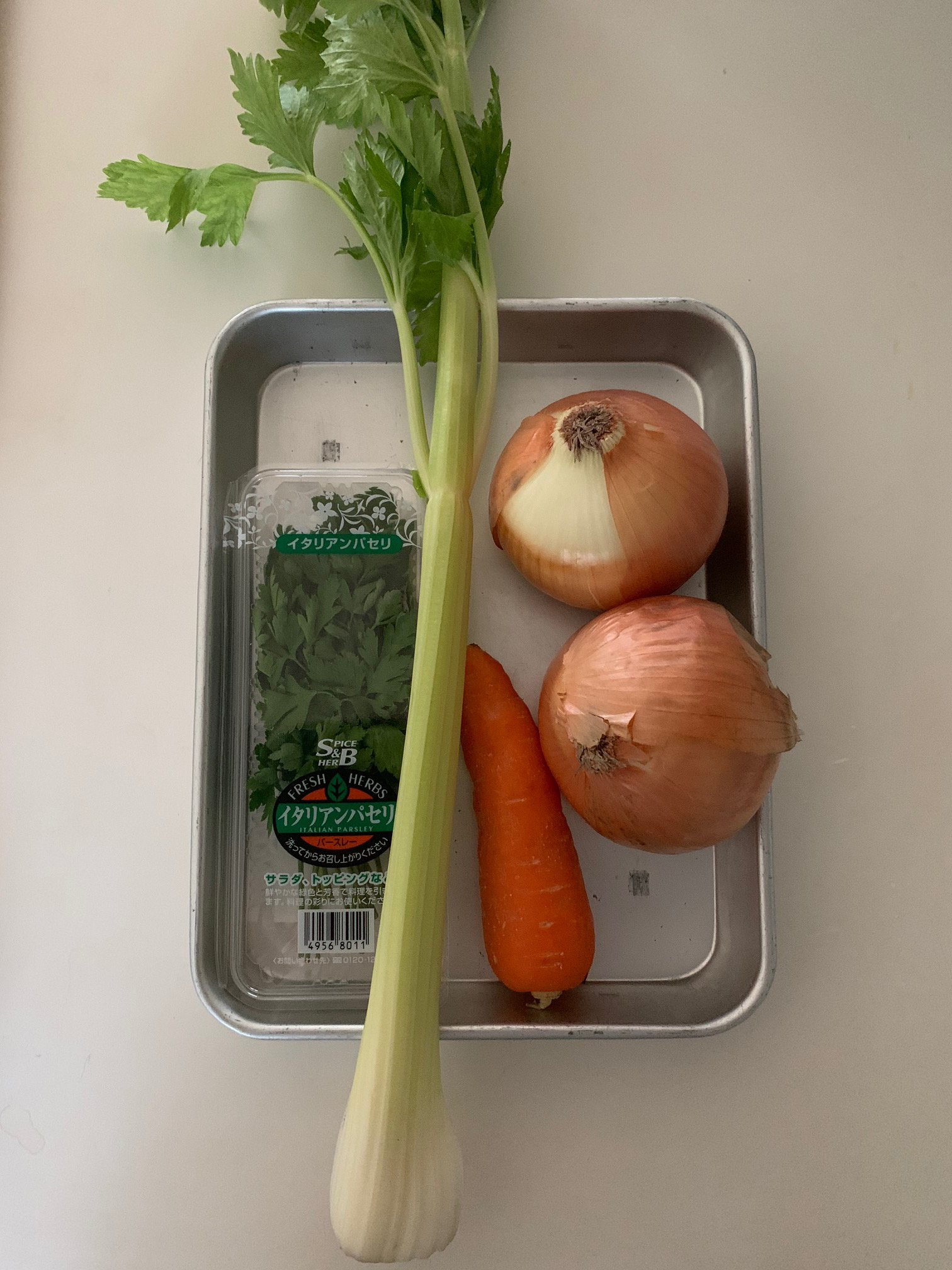 本誌にある通り、ブロードの材料は玉葱2個、人参1本、葉付きセロリ1本、イタリアンパセリ、ローリエを用意