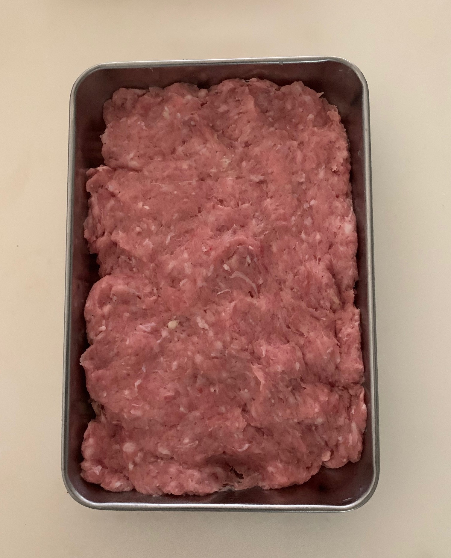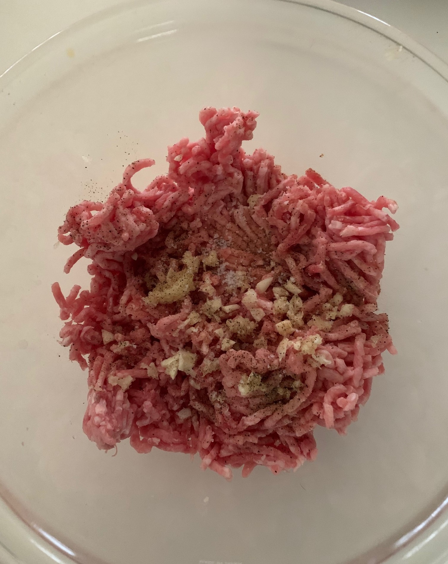 豚挽肉に塩、黒胡椒、すりおろしニンニク、ナツメグを入れる。ナツメグそのものは入手できなかったので粉で。