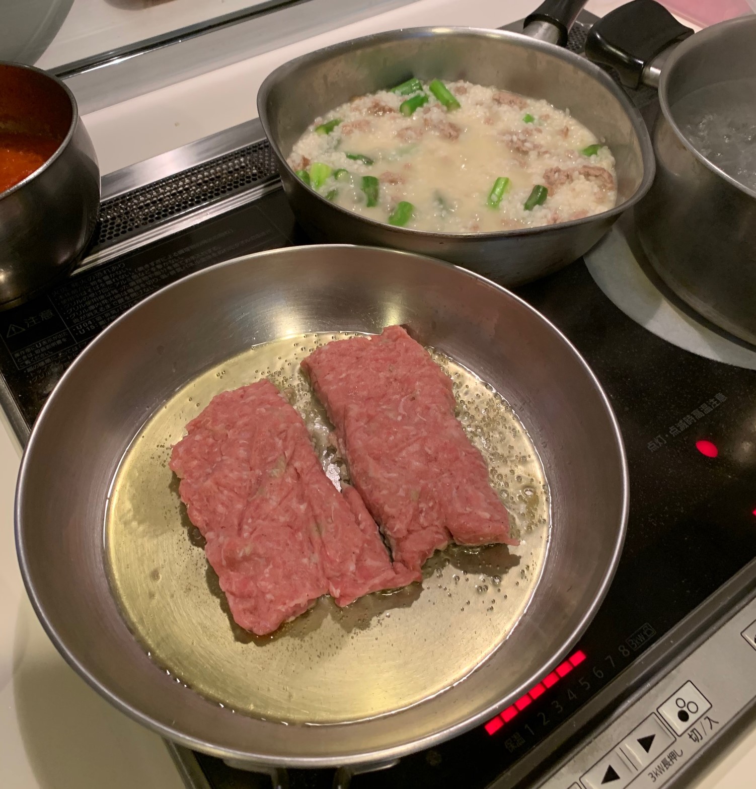 「肉の繊維が糸状になるまで練りこむ」という記述があったので、そこに注意。冷蔵庫で1時間寝かせます