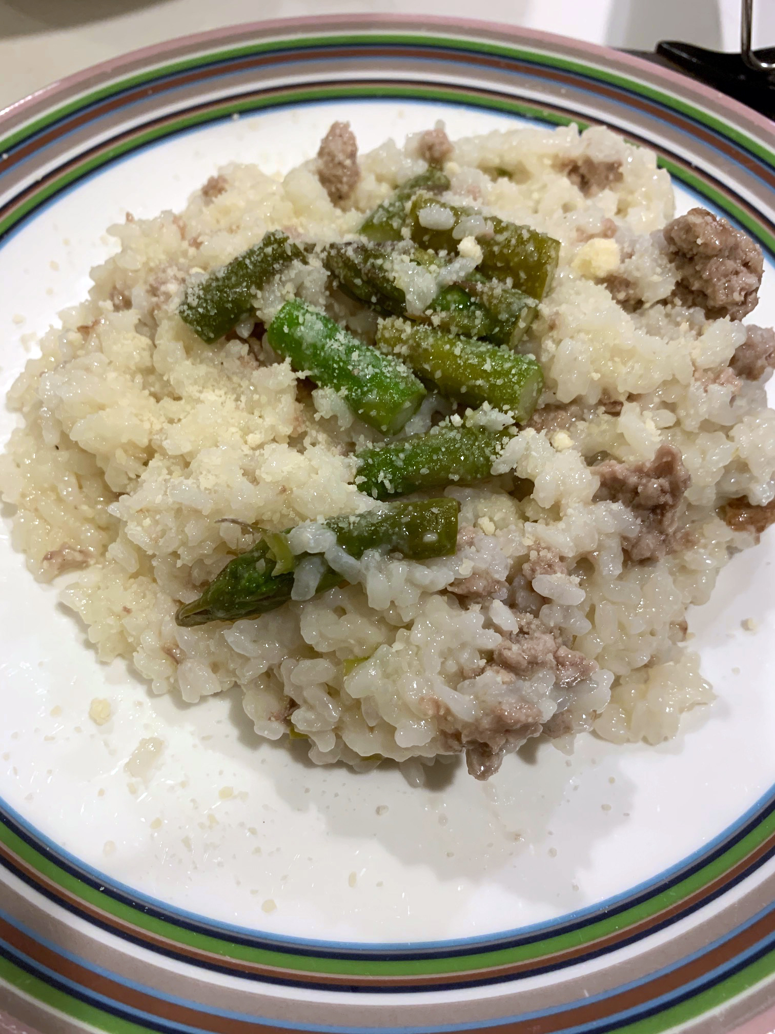 さてここからが腕の見せどころ。サルシッチャとアスパラのリゾットを作りつつ、ポモドーロスパゲットーニを仕上げられるのか。難易度高そう。