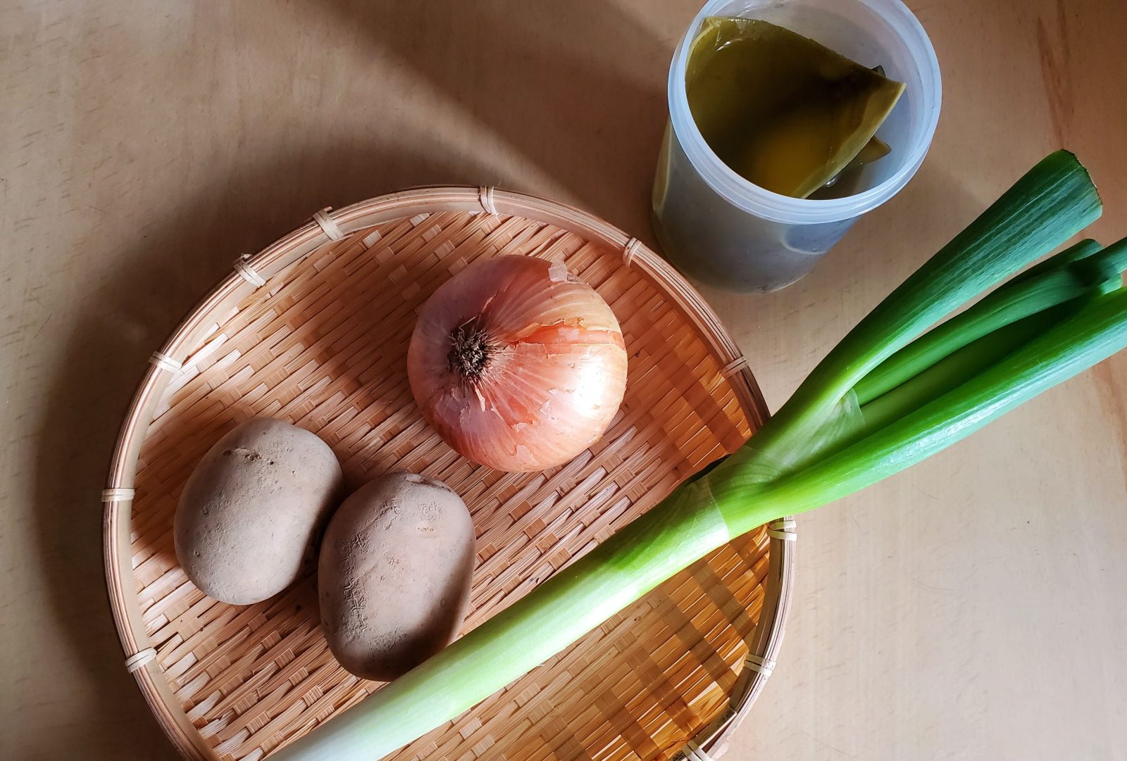 たまねぎ、じゃがいも(馬鈴薯)などストック野菜を中心に、材料は身近で手に入るものが中心。今回は西洋ネギの代わりに長ネギを使用しました。