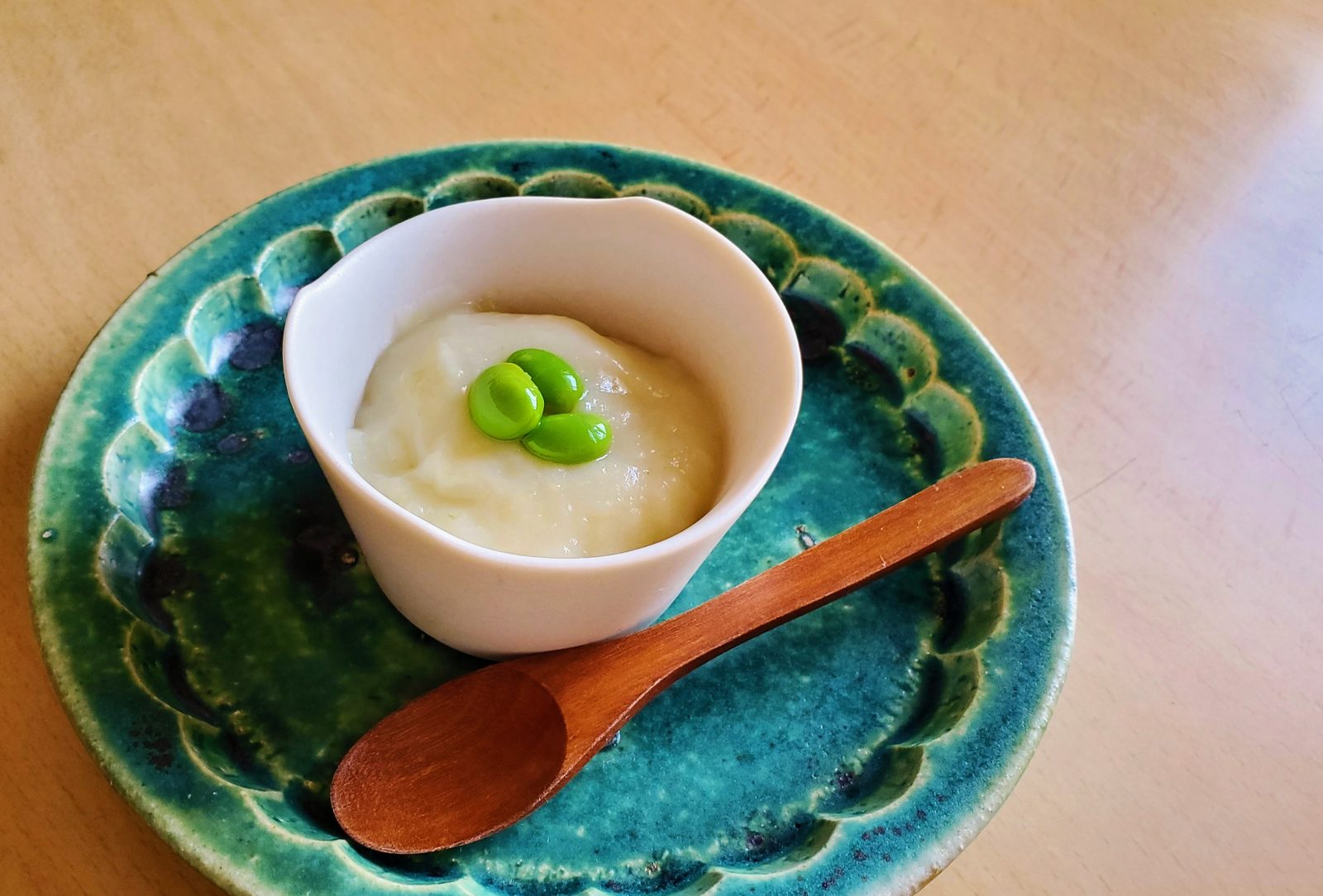 枝豆豆腐を入れた器にスープを注ぎ、枝豆を散らしたら出来上がり。じゃがいもの滋味深い味わいと枝豆の香りが初夏の風情。和風だしが味を底上げしてくれて、バターや生クリームの重たさも感じません。なめらかな口当たりが心地よく、食欲の落ちる時期にもうれしい一品。冷製はもちろん、あたたかくしても美味しそうです。