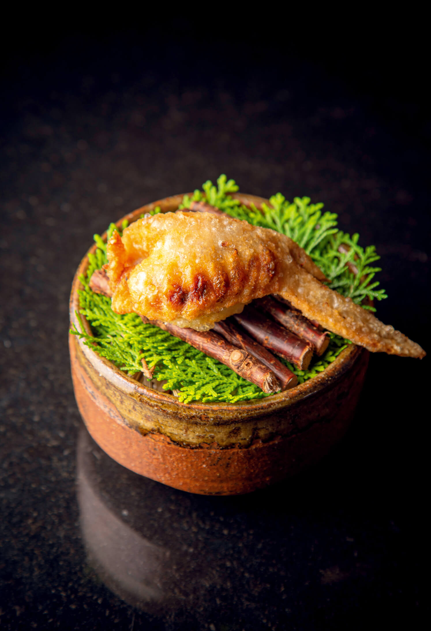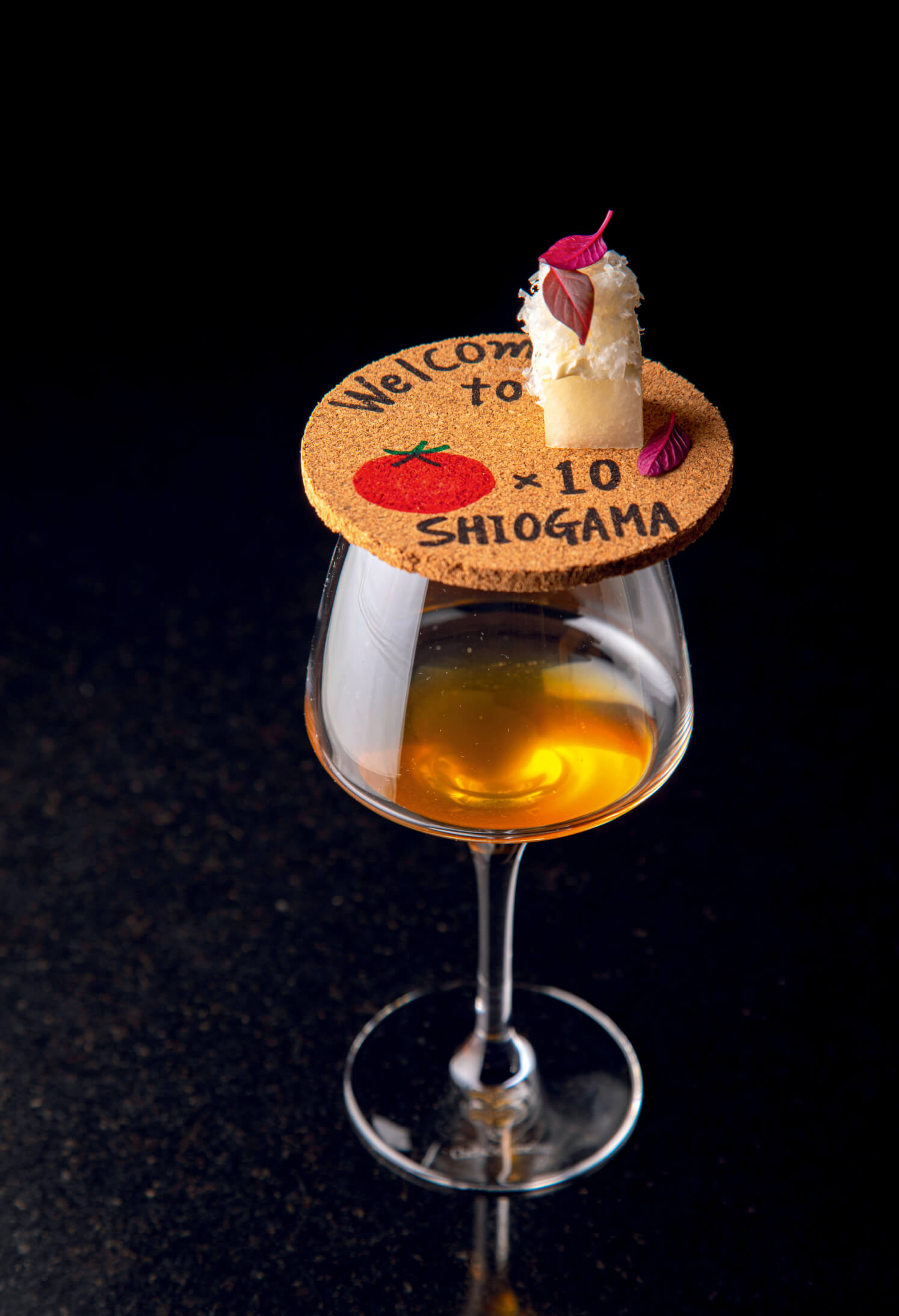 最初に「フライドチキンです」と冗談めかして登場したのはスパイシーな手羽先。熱々のチキンにかぶりつくと、もち米やトウモロコシなどがぎっしり入っている。ジャークチキンのバリエーションのような味付けで、コースの幕開けとしてはなかなか刺激的だった。続いて「マルゲリータです」とグラスが供される。梨とクリームチーズにパルミジャーノ、下の液体はトマト10個ぶんの濃厚なジュースだという。トマトの酸味にほのかな青い香り、チーズのコク、果実の軽やかな歯ざわり。それらが渾然一体になるとピッツァ・マルゲリータを食べているような摩訶不思議。