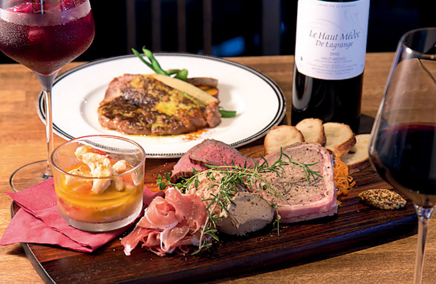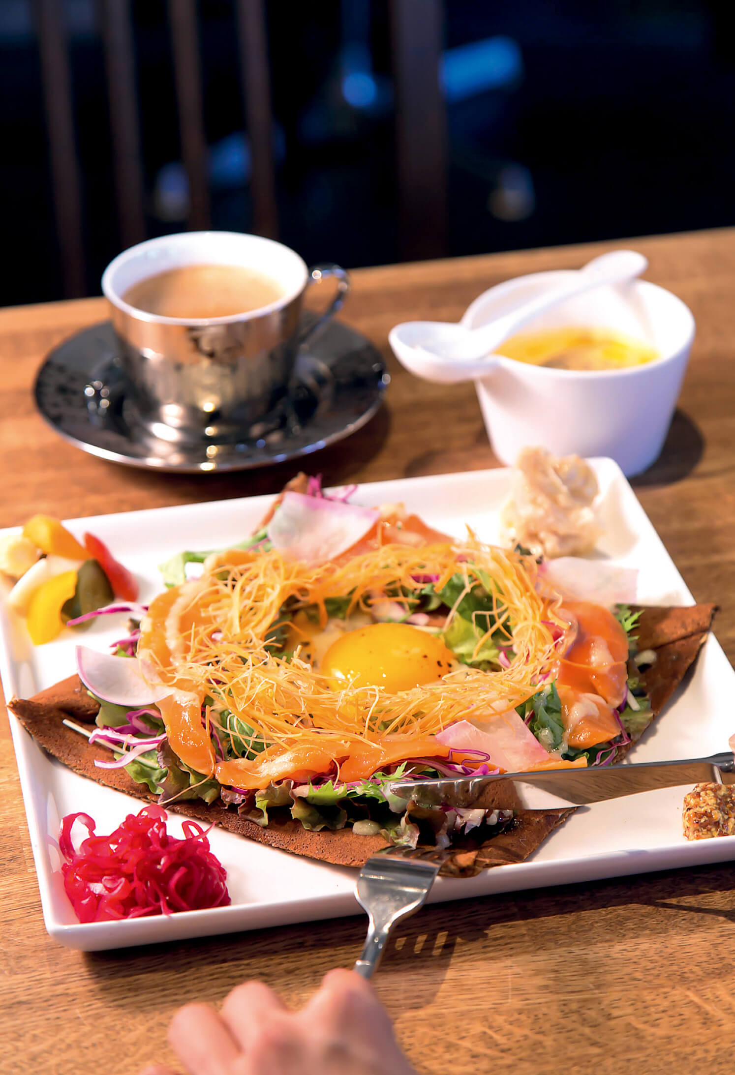 パリのビストロを訪れたような感覚で、カジュアルに料理とワインが楽しめるフレンチの店。ランチはオリジナル配合の福井県産そば粉で作るガレットが人気で、外はサクッ、中はもっちりの歯ざわりが絶妙だ。ディナーのスペシャリテは、パテやレバームース、リエットなどの自家製シャルキュトリー。ハーブやスパイスが心地よく香る「カテキン豚のカフェ・ド・パリ風」(1490円)にもファンが多い。店のセラーにずらりと並んだワインと共に、リラックスした時間を過ごしてほしい。