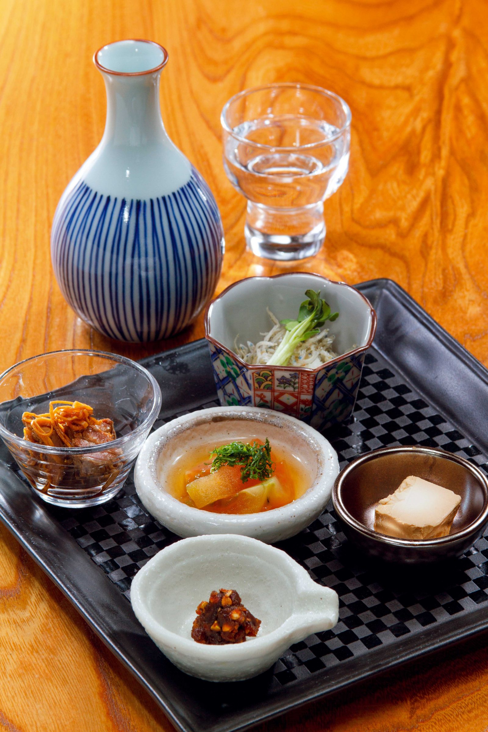 「酒肴五点盛り」。そば屋ならではのつまみが並ぶ。日本酒もそばと相性のよいもの。