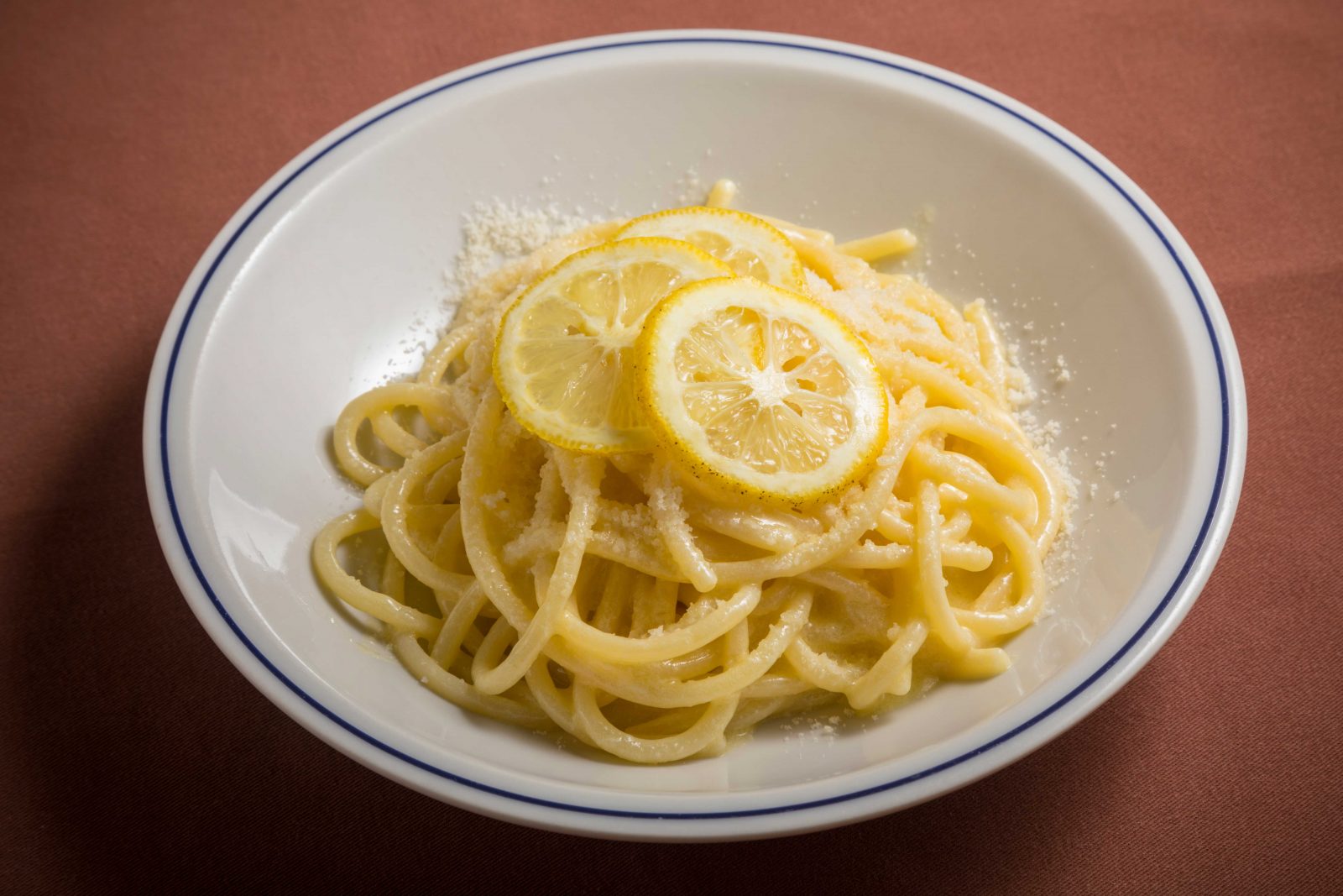 パスタの上にチーズのみ、その潔いビジュアルに心奪われる。ひと口食べると、バターとチーズのコクの中に光る、爽やかな酸味。その正体はレモンの皮と果汁だ。