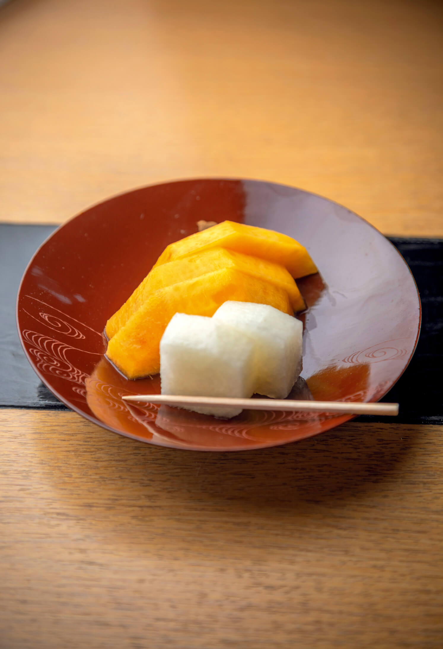 「これもよかったら、食べてみてください」と出してくれたのは鮮やかな橙色の果実。柿かしら、と思ったそれはネクタリンで、酸味よりも甘味が強く、味わいが濃い。樹上で完熟する様子を見ながら摘み取る時期を決め、もいできたばかりだという。採れたて食材の良さは多くの人が知るところだろうが、この店ではそれをスタート地点に料理をつくる。「農を楽しむ」、だから『のうらく伸』。