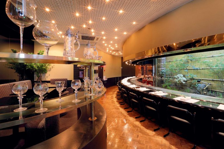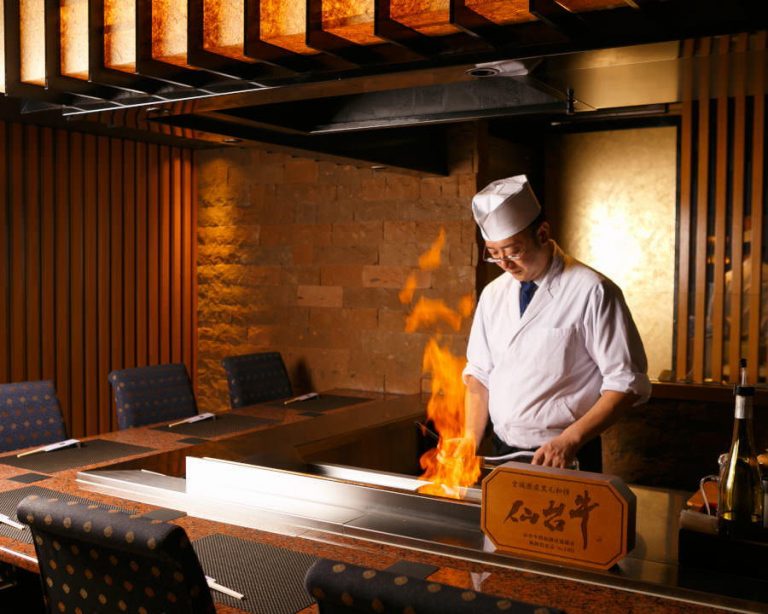 創業31年目となる国分町の店。華やかながらも落ち着いた店内には、鉄板焼きを目の前で楽しめるカウンター席や掘りごたつの完全個室席、国分町通りを眺めながらのテーブル席を用意。さまざまなシーンに合わせて一番心地よい空間を提供してくれる。