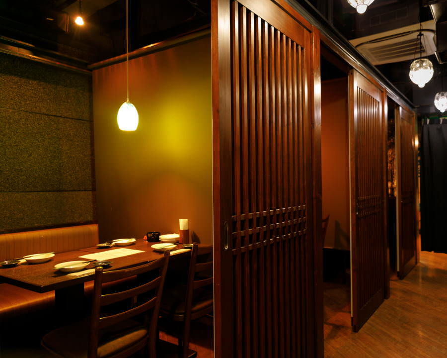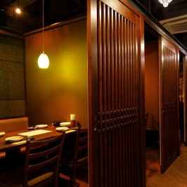 気兼ねなく過ごせる半個室のある店内。優しい灯りが寛ぎの空間を演出する。