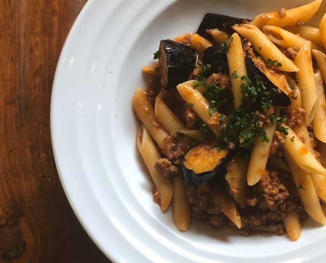 D:揚げ茄子と高清水ポークのミートソースパスタ