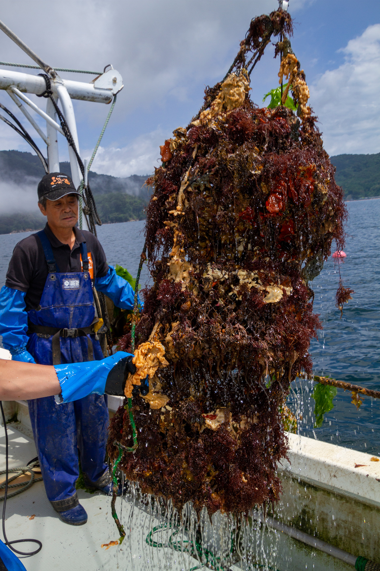 ムール貝はかごに入れて畜養している。海が豊かなので他の生物もびっしりついていた。撮影=菊地淳智