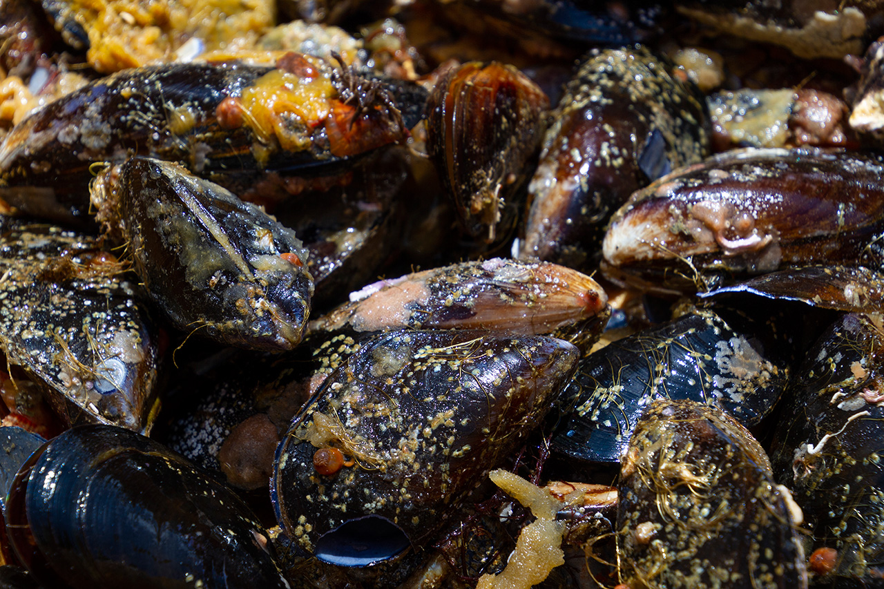 自然の環境で大きく育ったムール貝。これをきれいに掃除し、選別してから出荷する。撮影=菊地淳智