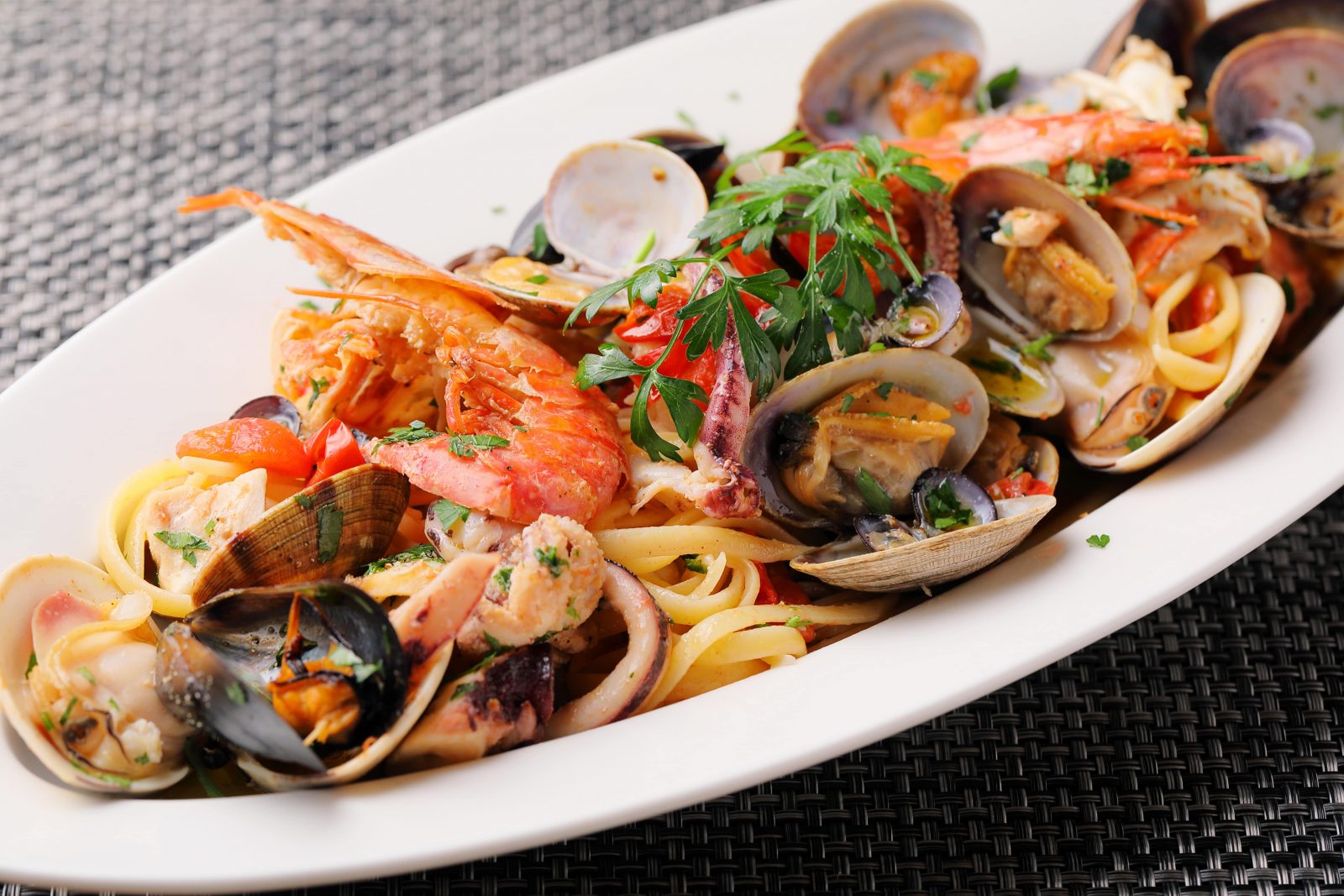 多彩な魚介を一皿で楽しめる「三陸魚介たっぷりの漁師風パスタぺスカトーレ 極太リングイネで」(2800円)。