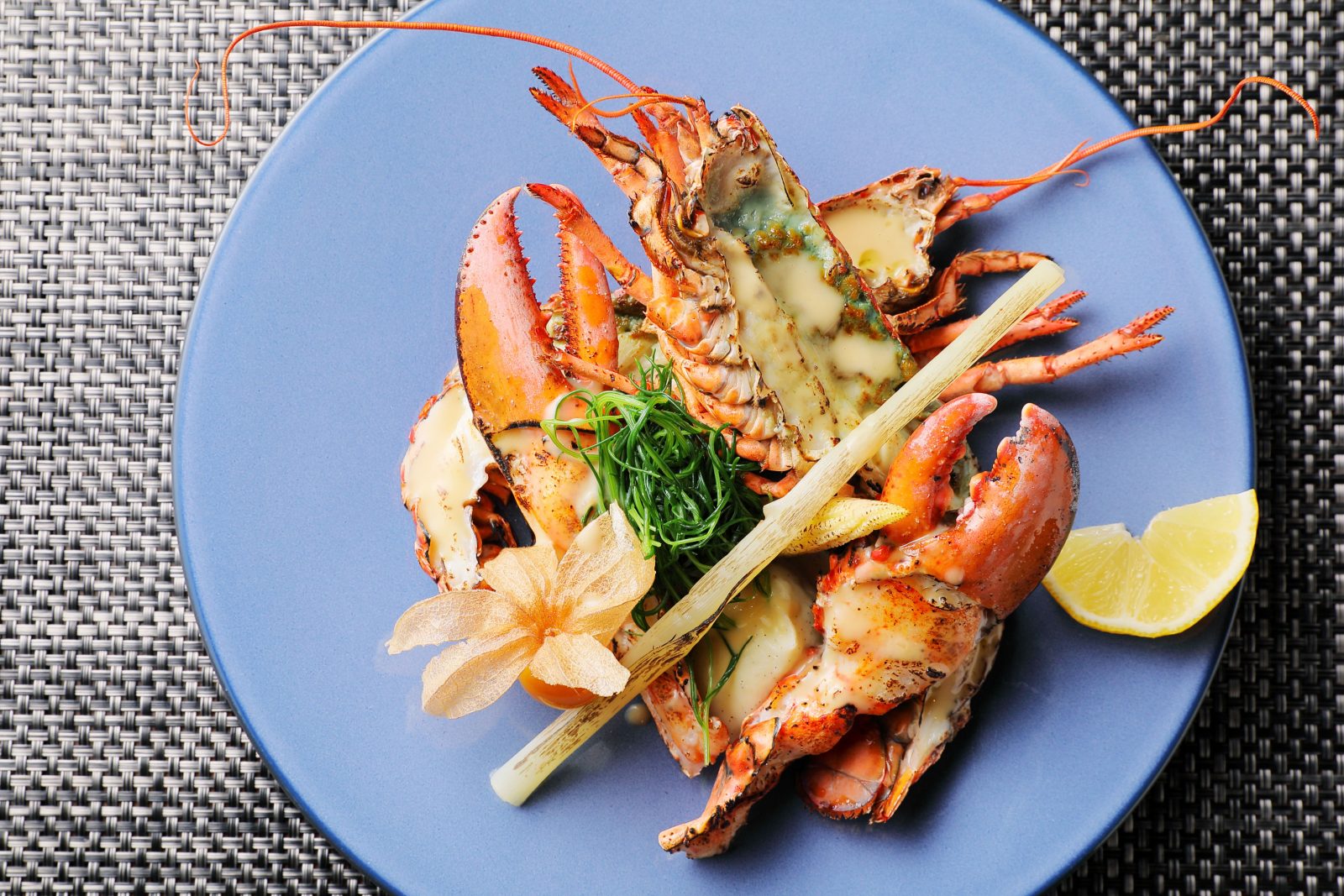 「オマール海老の炭火焼き シチリア産トラパニの海塩と瀬戸内レモンで」(4800円)。