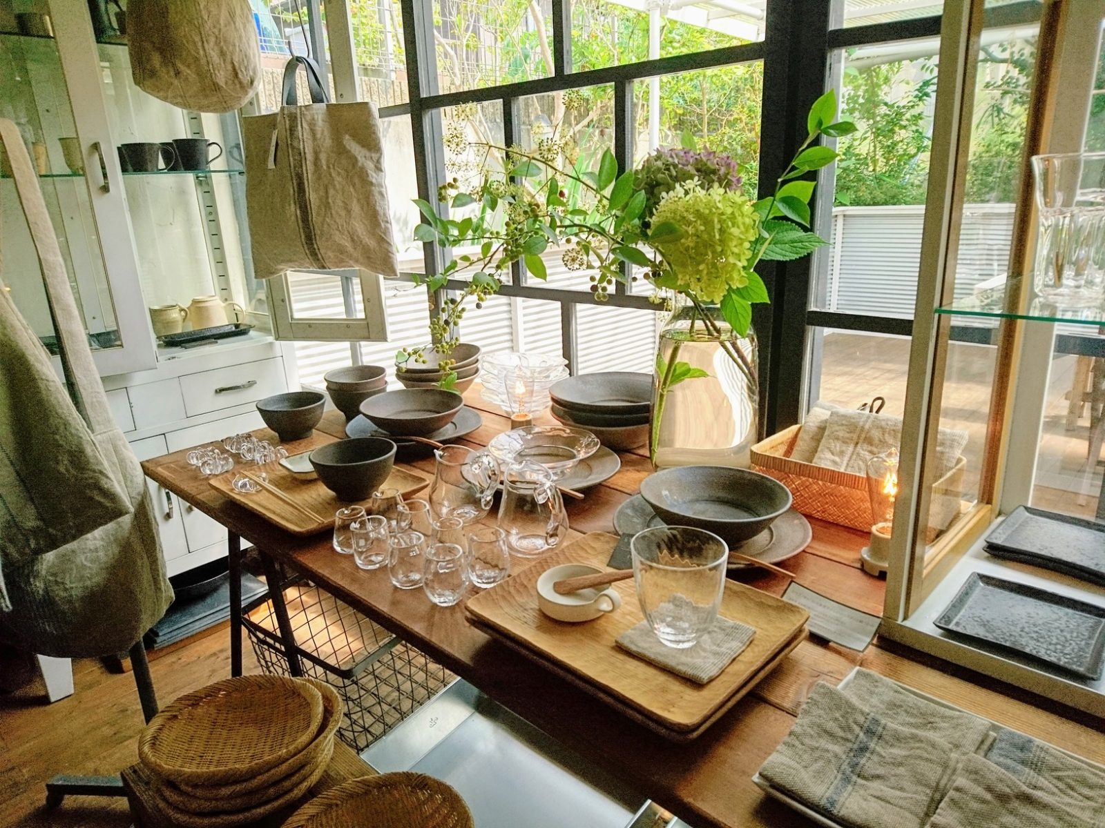 大きな窓からの光、木々の揺らぎなど、季節や時間の移ろいを感じられる空間は、日々の暮らしを思い浮かべるのにもぴったり。この道具やうつわがわが家にやってきたら…そんな幸せな光景を思い浮かべながら、なんとも穏やかな気分に浸れます。