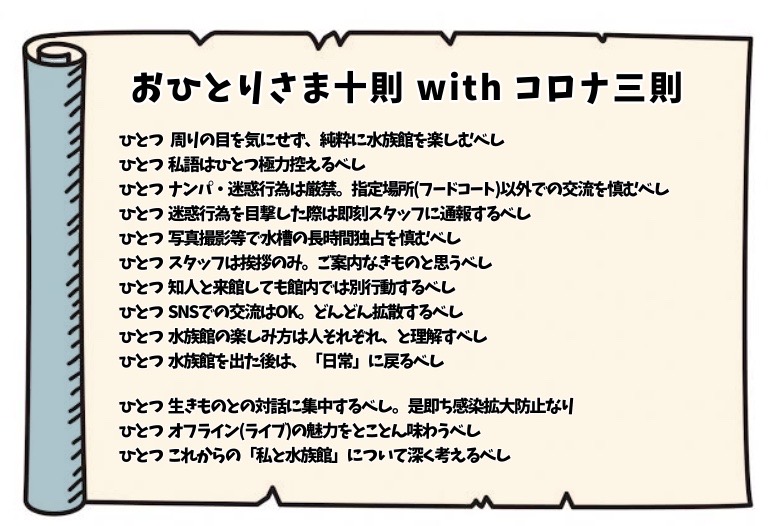 仙台うみの杜水族館では、このイベントを心ゆくまで楽しめるよう、「おひとりさま十則」を設定。さらに、安心して水族館を利用できるように感染対策の項目や、水族館の魅力・存在について今だからこそ考える機会となるよう、「withコロナ三則」を加えています。