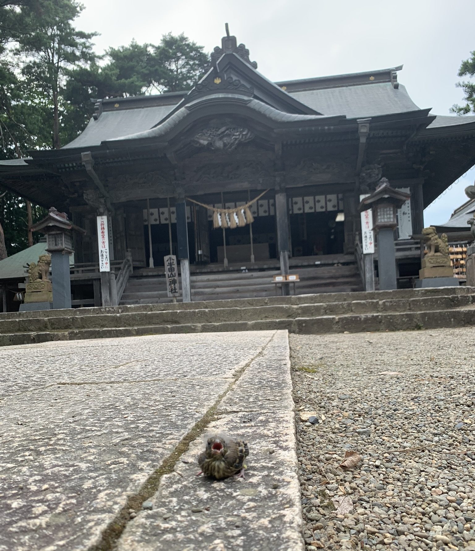 ほっこりとした気持ちで山の神様に手を合わせて振り返ると、赤ちゃんを連れたご家族が肩を寄せ合い、晴れやかな笑顔で記念撮影を。そのすぐそばで、生まれたばかりのひな鳥が「チュッチュッ」と声をあげながら、羽を広げ元気に飛び立っていきました。
