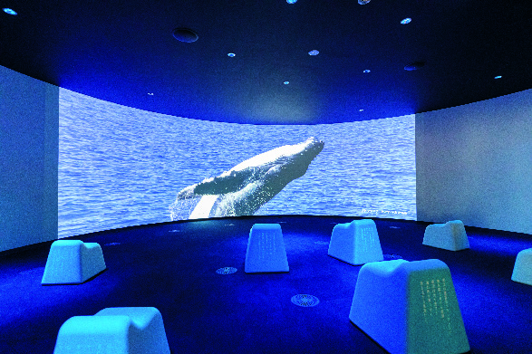 ホエールランド内にはクジラが海を泳ぐダイナミックな映像を大型のパノラマスクリーンで楽しめるシアターエリアが併設されている。