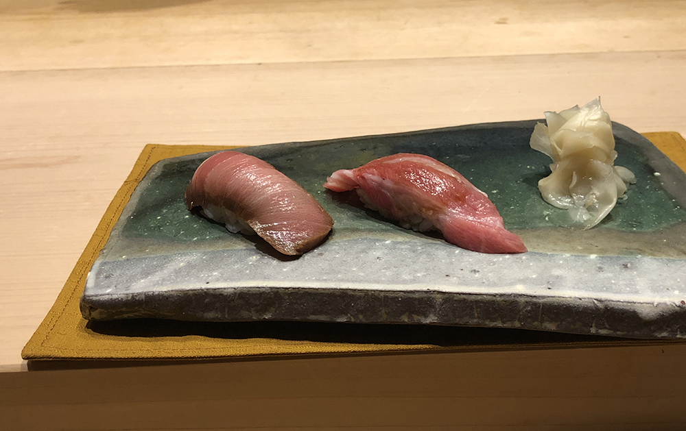 握りは、親方が目を輝かせながら捌いていたマグロからスタート。まずが軽く漬けにした中トロから。タレの味わいとマグロの香りがふんわりと口中に漂います。食用米のササニシキで醸した「ササニシキ純米大吟醸」は、米のやわらかな旨み・甘みがありつつ、軽やかでバランスのいい一杯。タレ、しゃりにやさしく寄り添うような口当たりです。