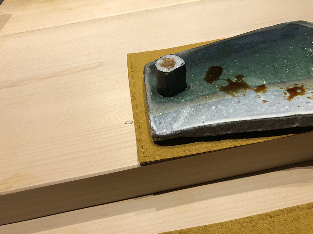 巻物はかんぴょう巻き。私は子どもの頃からかんぴょう巻きが大好物です。「かんぴょうを普通に調理したらこうなるよ」と親方はおっしゃいますが、柔らかく溶けるような舌触りのかんぴょう! 3個あったのですが、美味しすぎて写真を撮るのを忘れてしまいました。オーク樽の香りを移した「