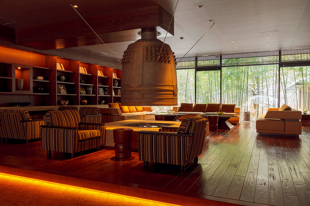「ライブラリーラウンジ」。巨大な梵鐘が囲炉裏の上に吊り下げられている。